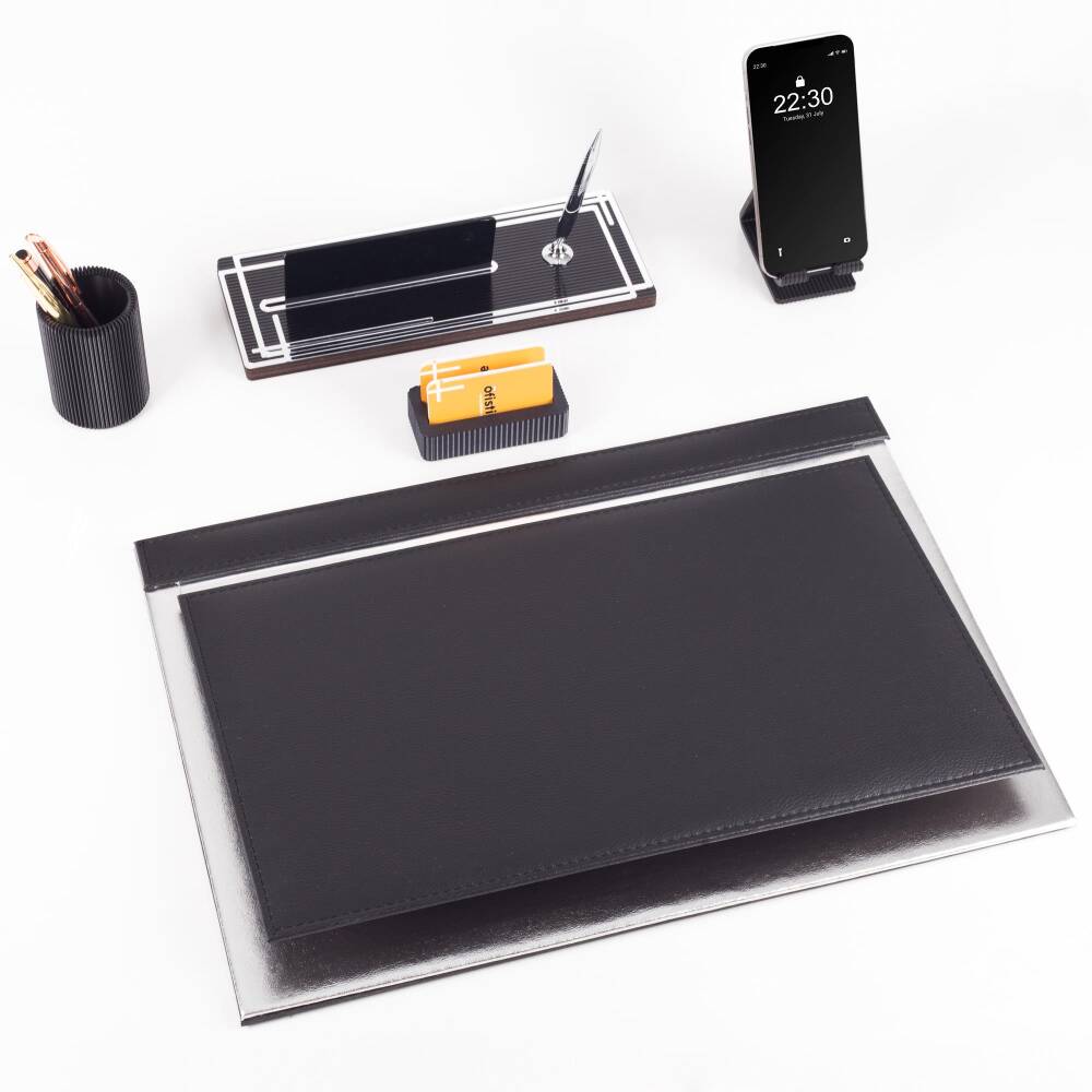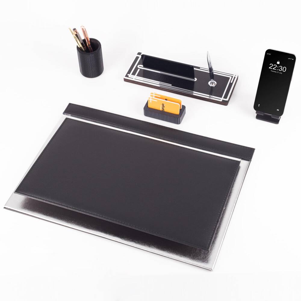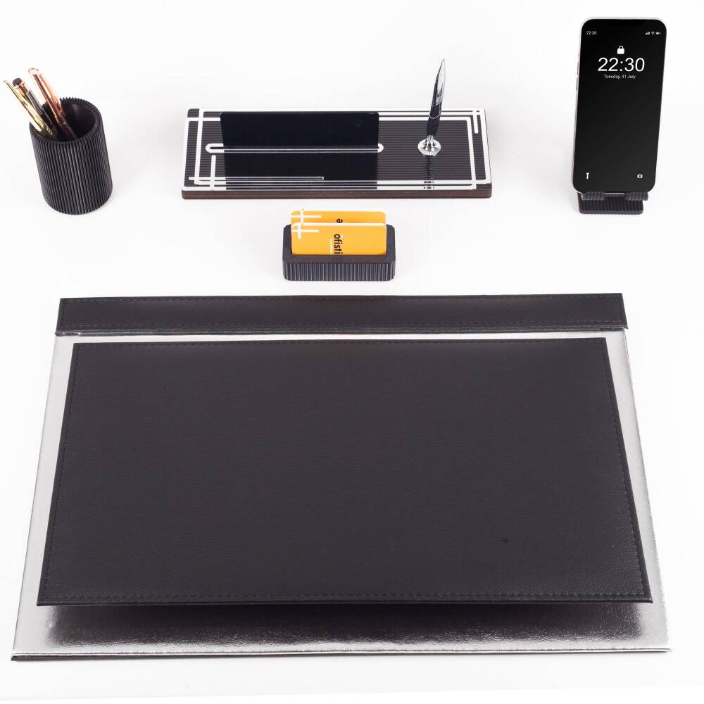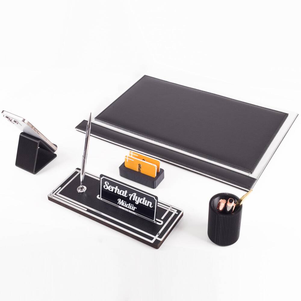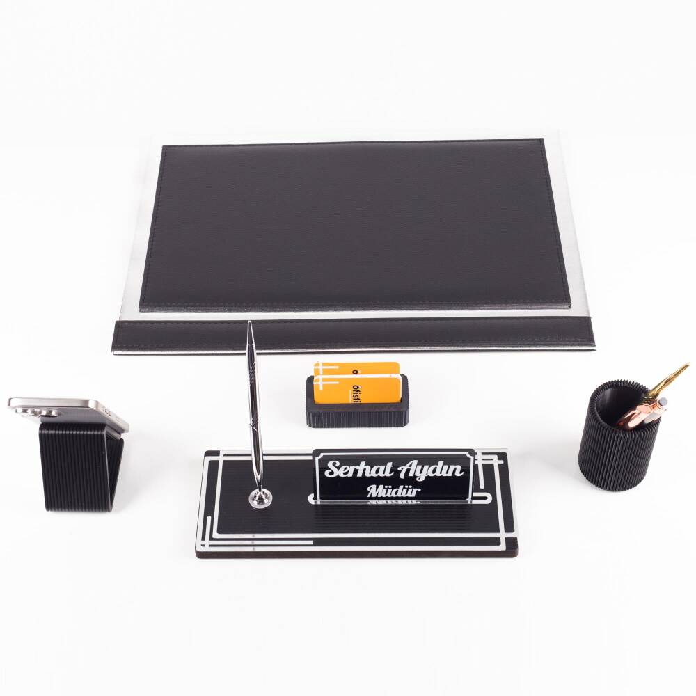 Apollo Gümüş Varak Desenli Siyah Deri Sümen Seti İsme Özel Ofis Masa İsimliği Masaüstü Sümen Takımı