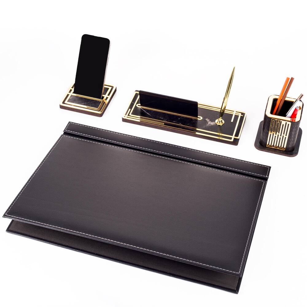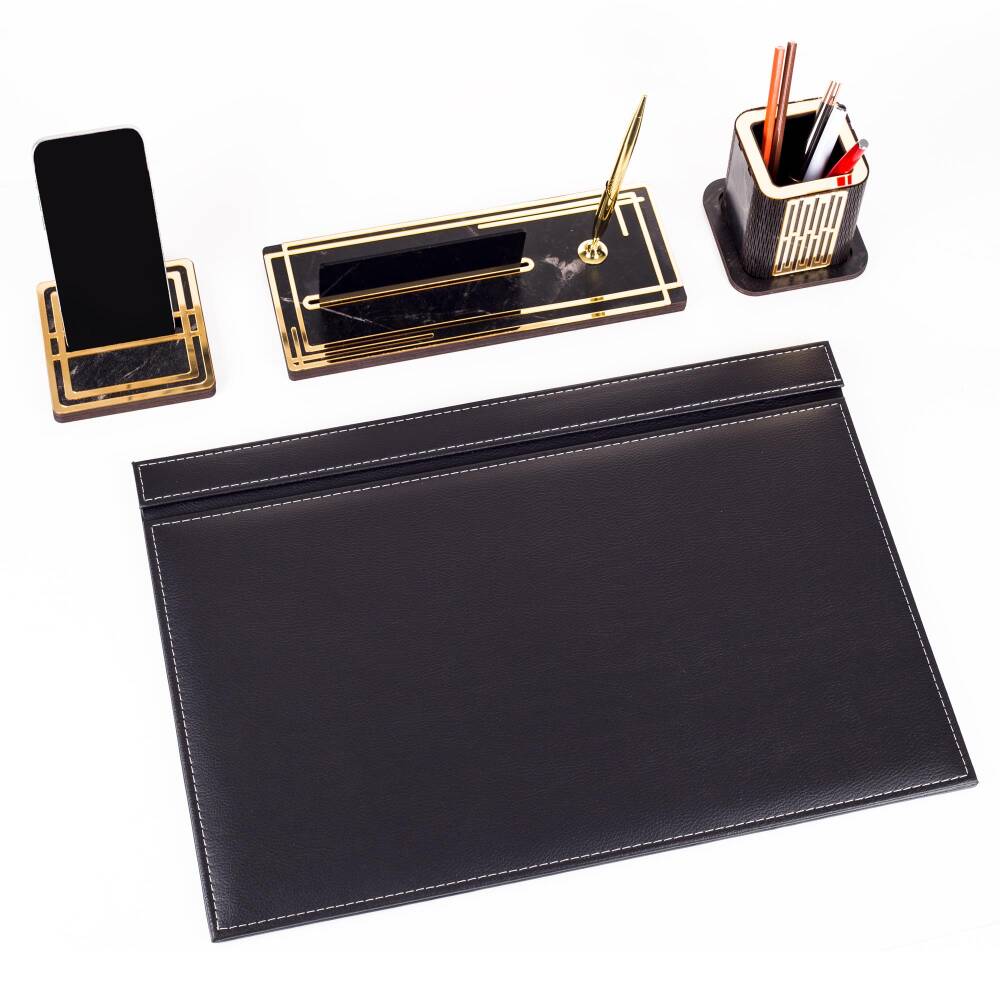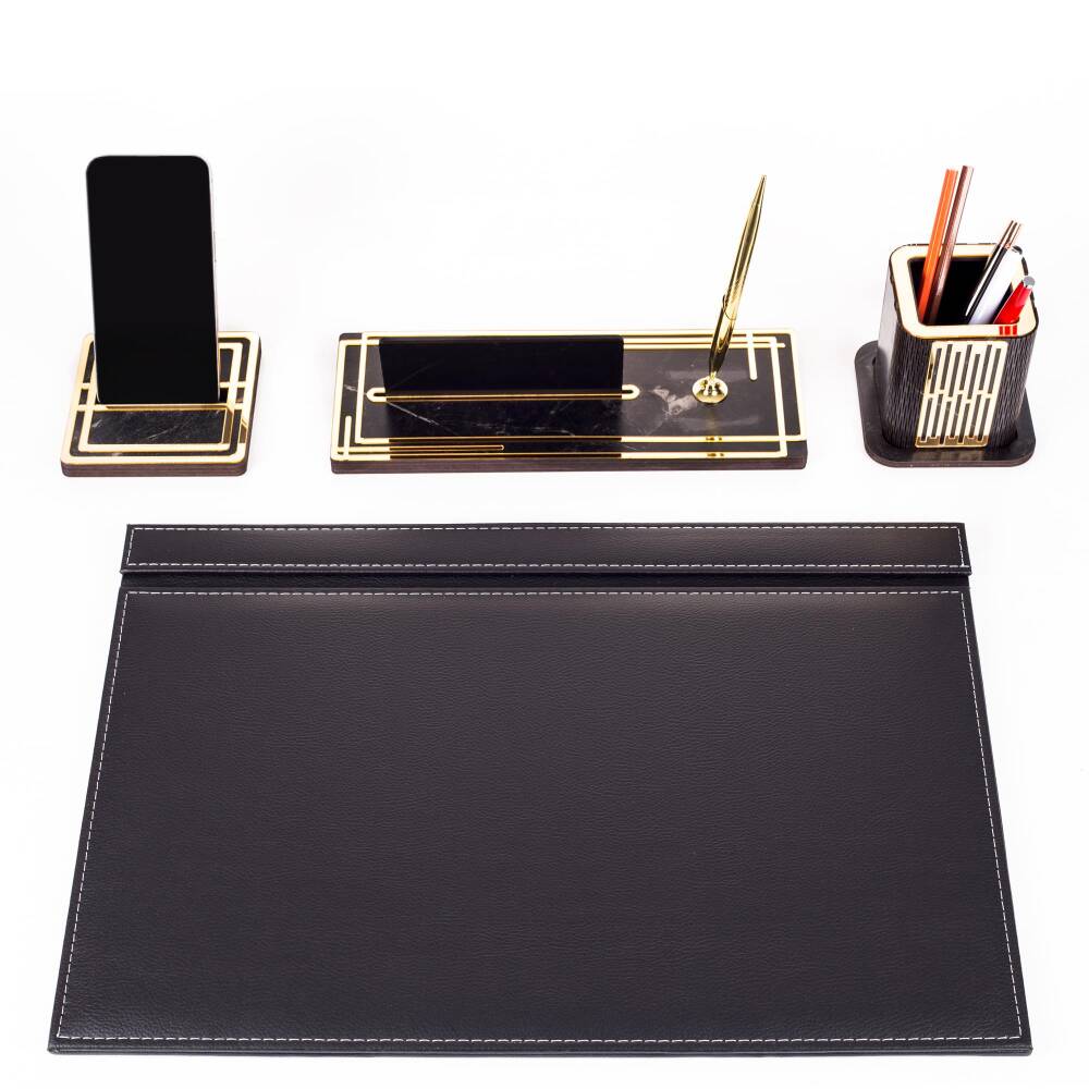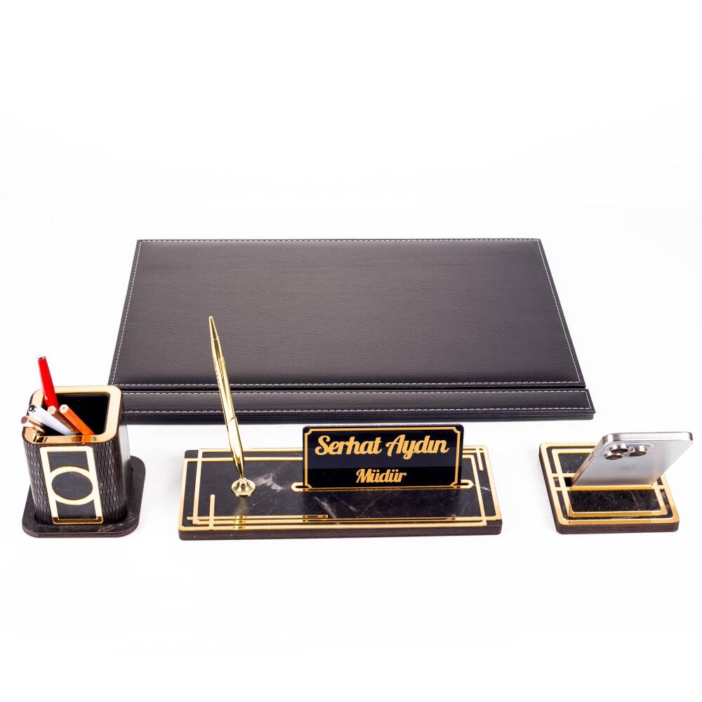 Ürün içeriğinde, 28x12cm ebatında 12mm kalınlığında, kalemli ahşap isimlik seti, 11x11cm ebatında altın renk telefon tutucu, ahşap kalemlik mevcuttur.