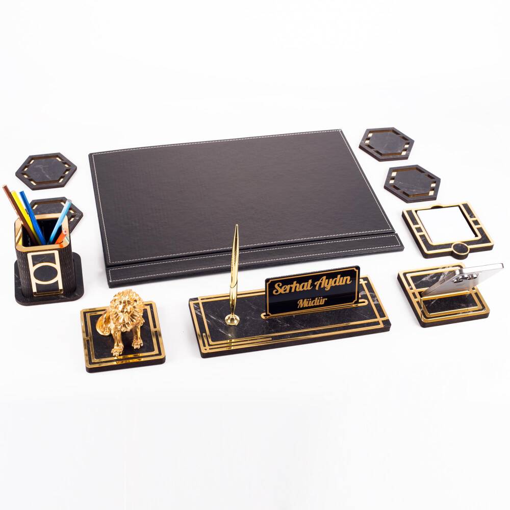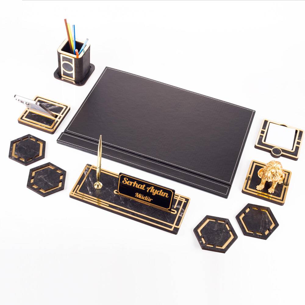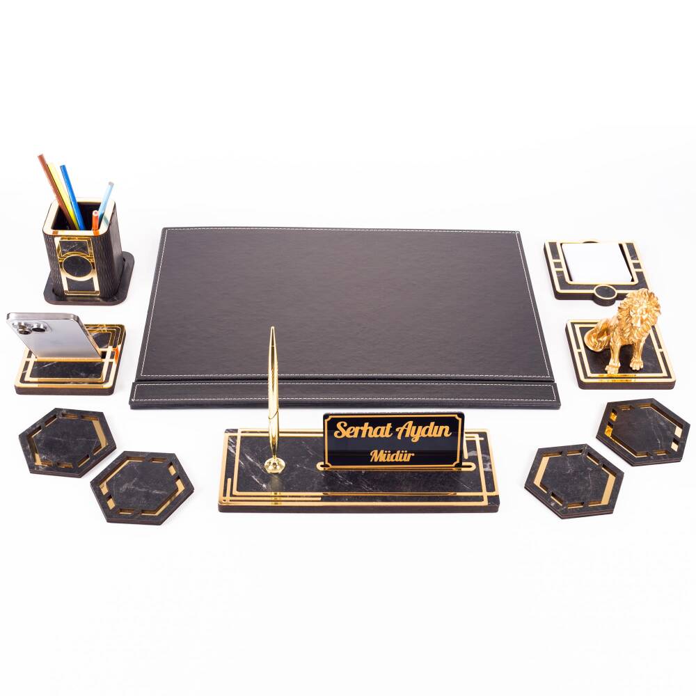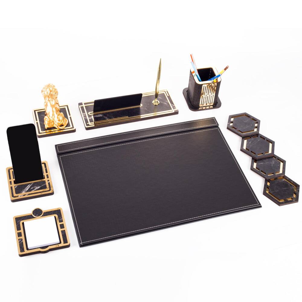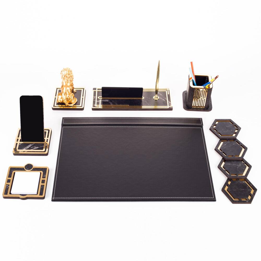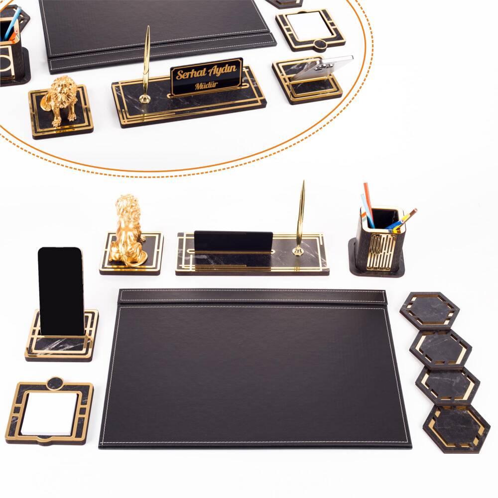 Ürün içeriğinde, 28x12cm ebatında 12mm kalınlığında, kalemli ahşap isimlik seti, 11x11cm ebatında altın renk telefon tutucu, ahşap kalemlik, 4 adet bardak altlığı ve not kağıtlığı mevcuttur.