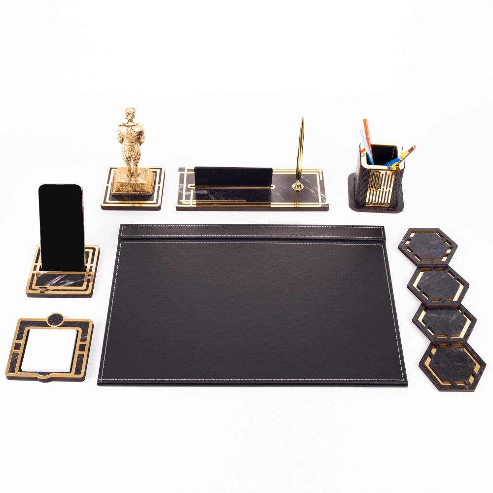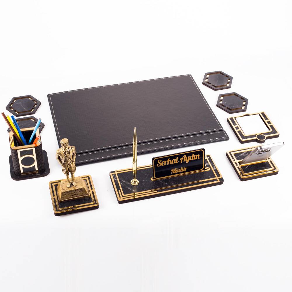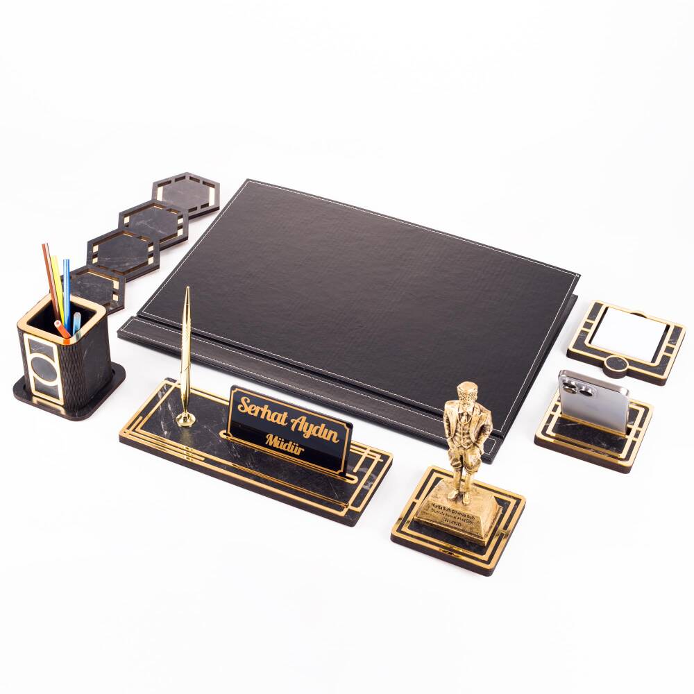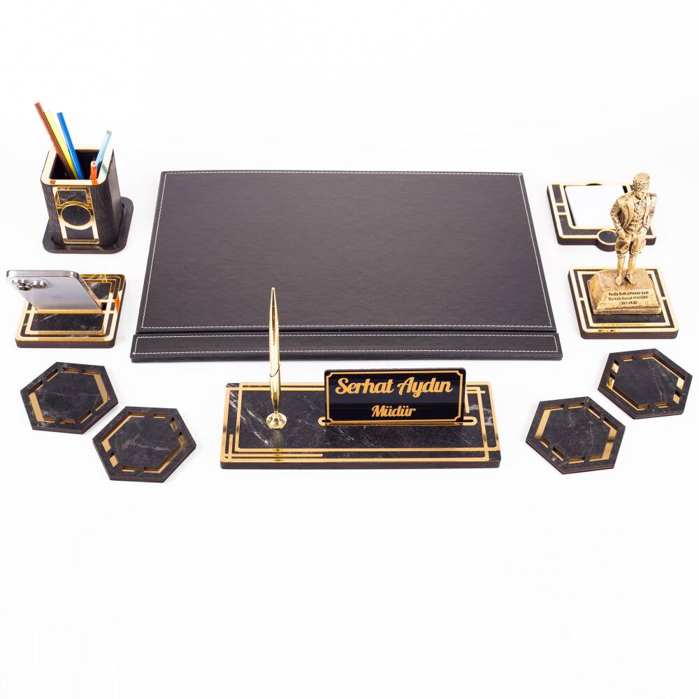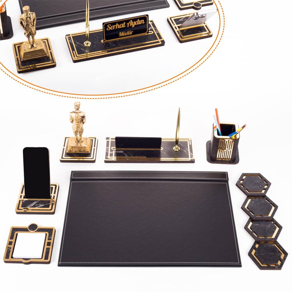 Ürün içeriğinde, 28x12cm ebatında 12mm kalınlığında, kalemli ahşap isimlik seti, 11x11cm ebatında altın renk telefon tutucu, ahşap kalemlik, 4 adet bardak altlığı ve not kağıtlığı mevcuttur.