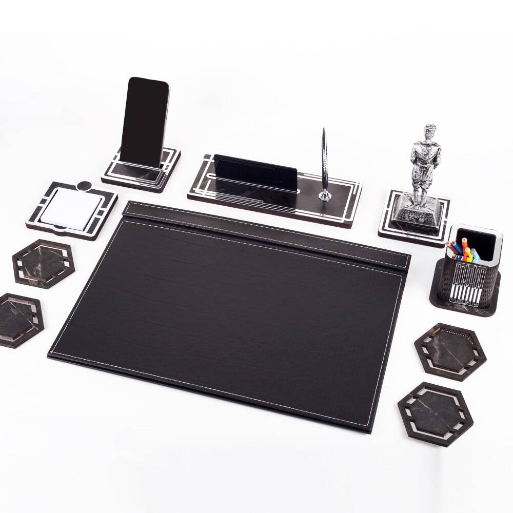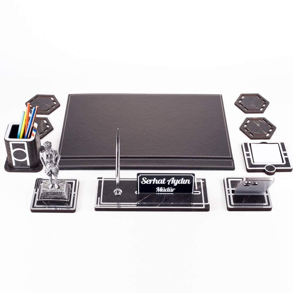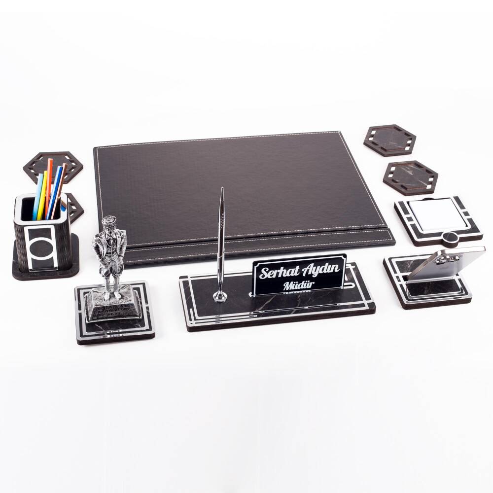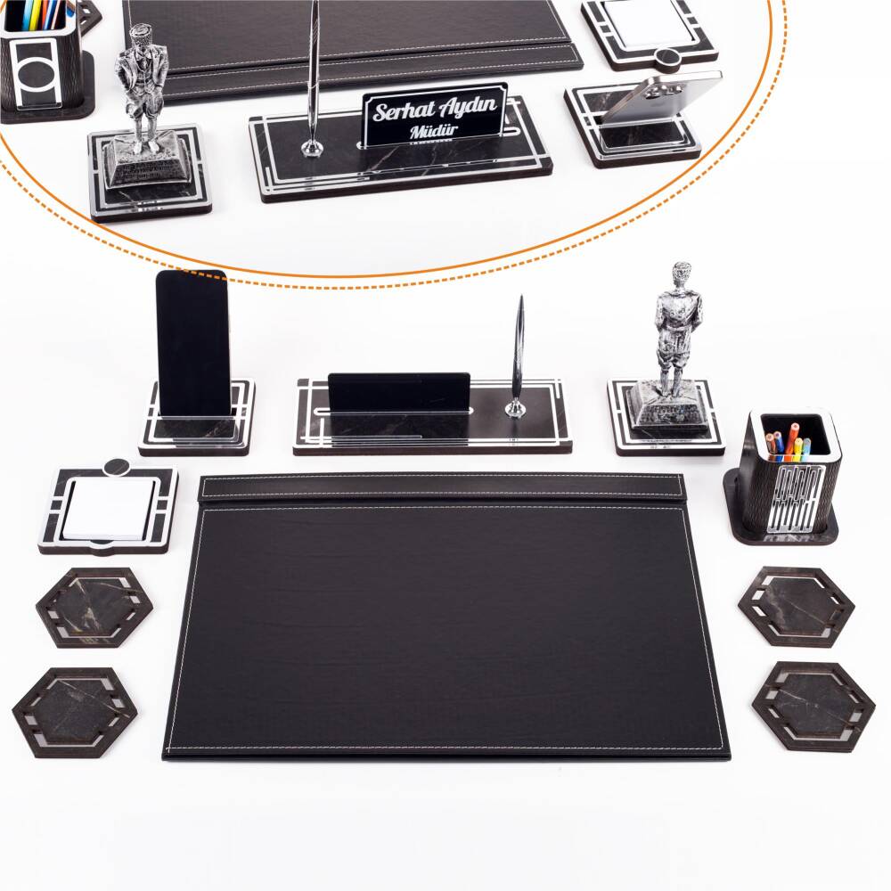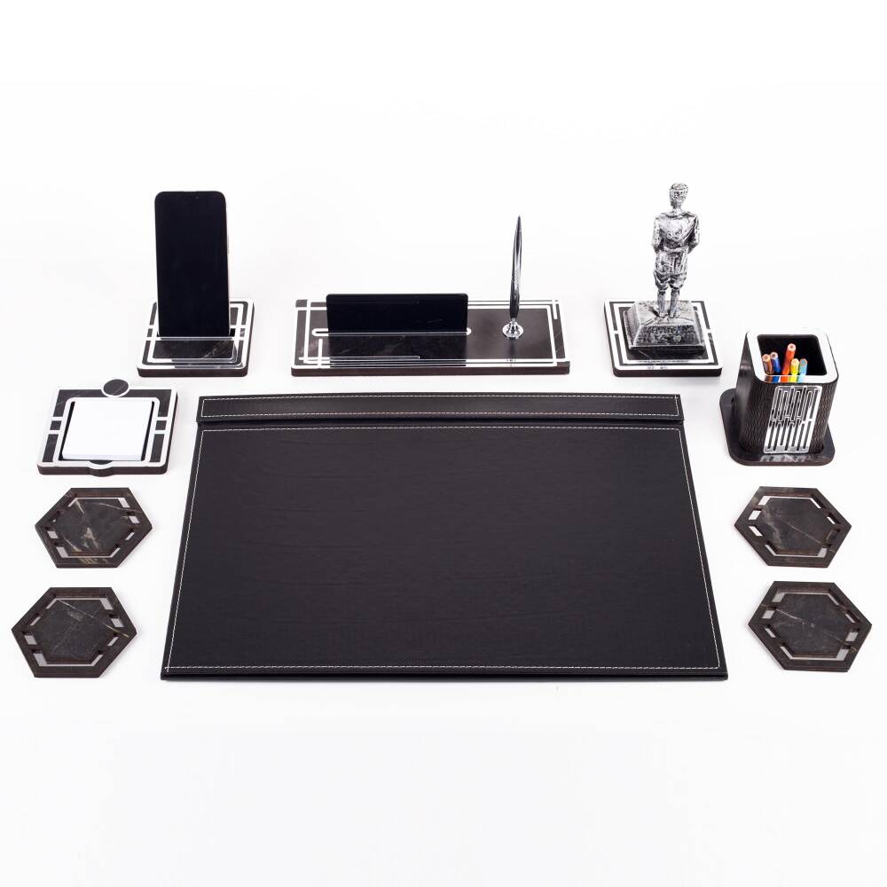 Ürün içeriğinde, 28x12cm ebatında 12mm kalınlığında, kalemli ahşap isimlik seti, 11x11cm ebatında gümüş renk telefon tutucu, ahşap kalemlik, 4 adet bardak altlığı ve not kağıtlığı mevcuttur.