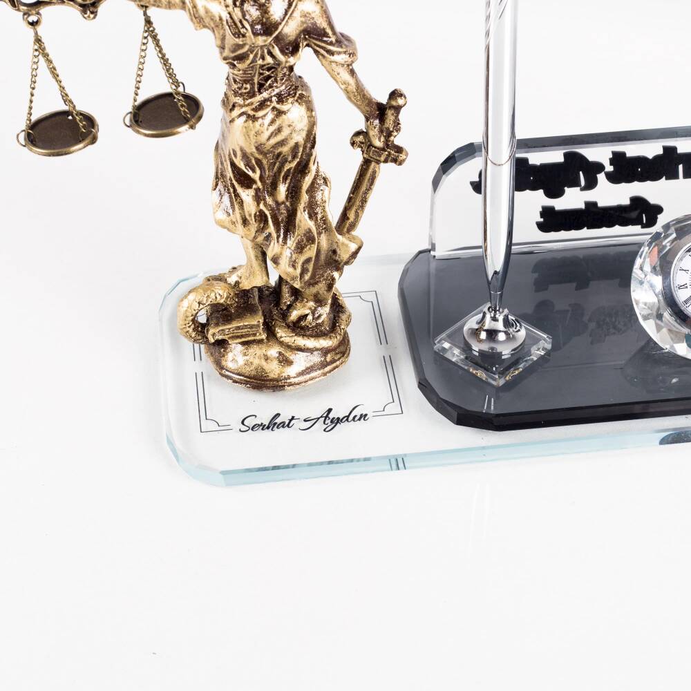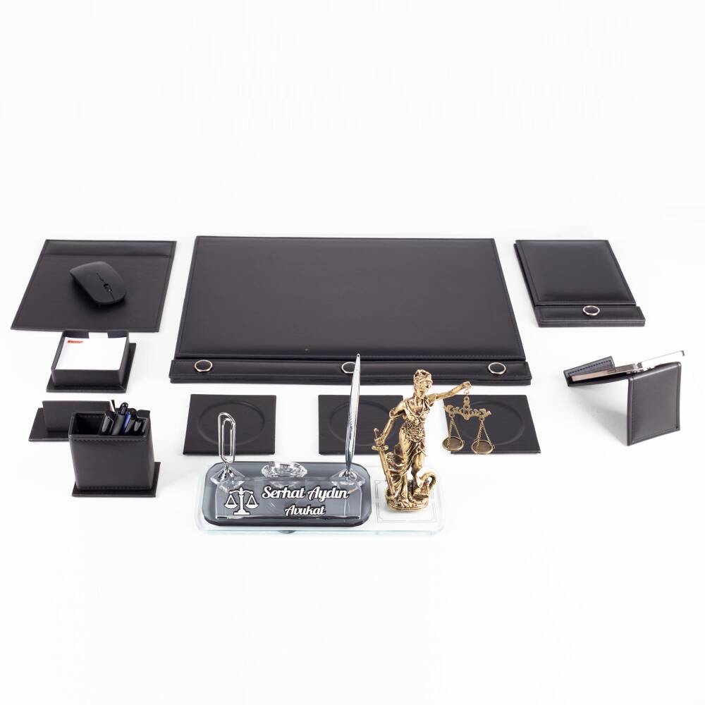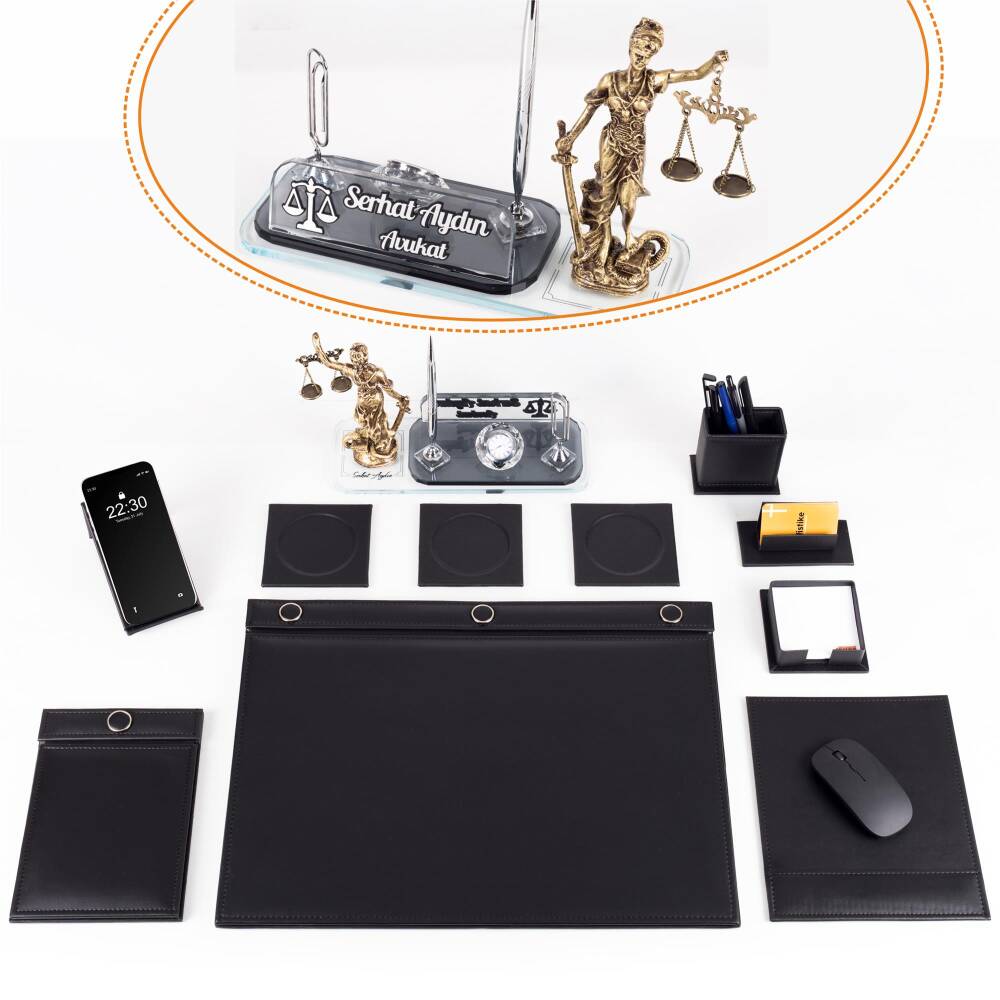 Avukata Themis Heykelli Düğmeli Siyah Sümen Takımı İmza Tasarımlı Masa İsimliği Hediye