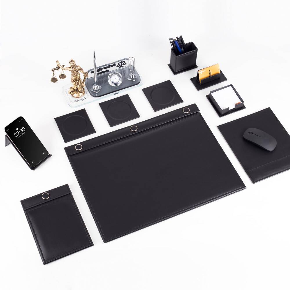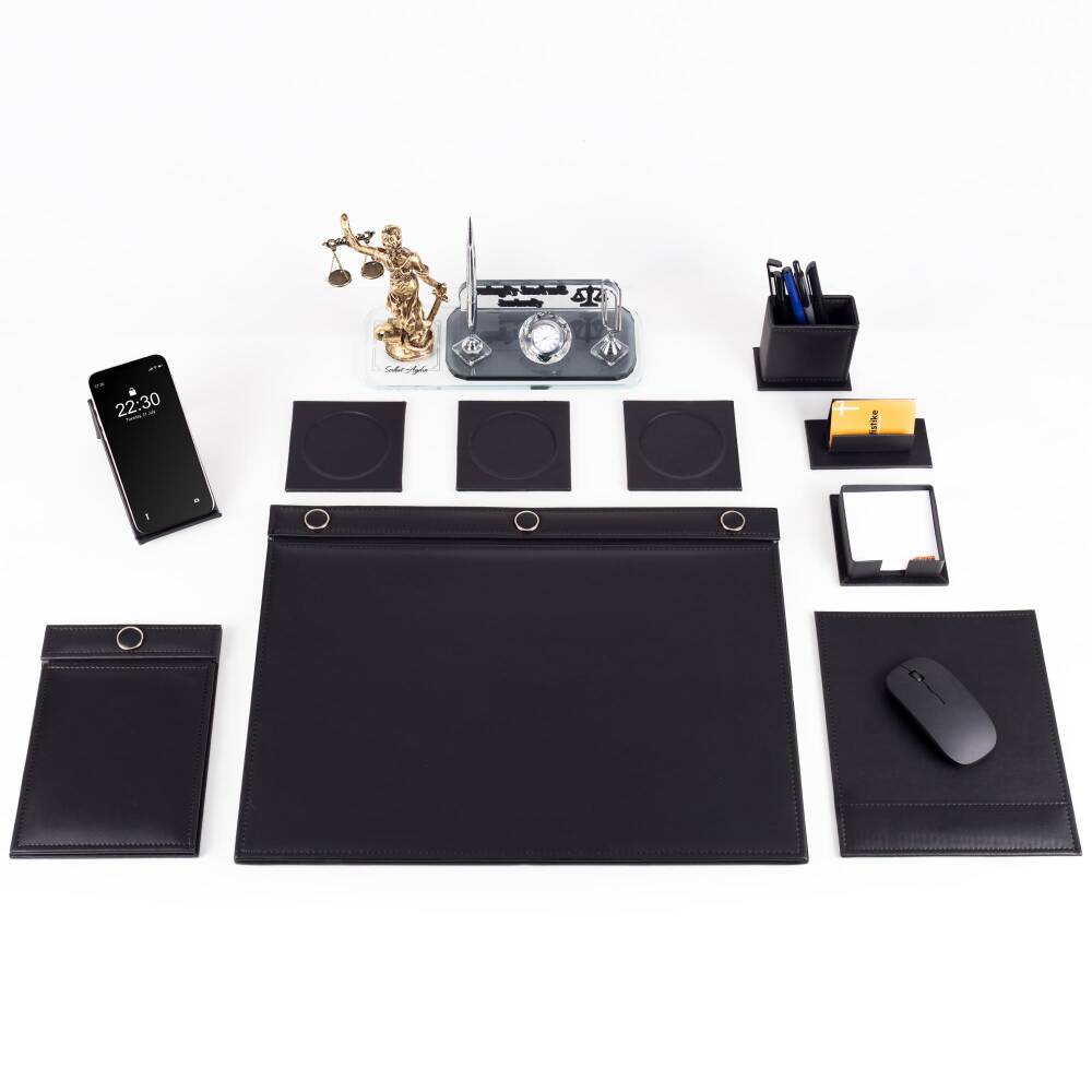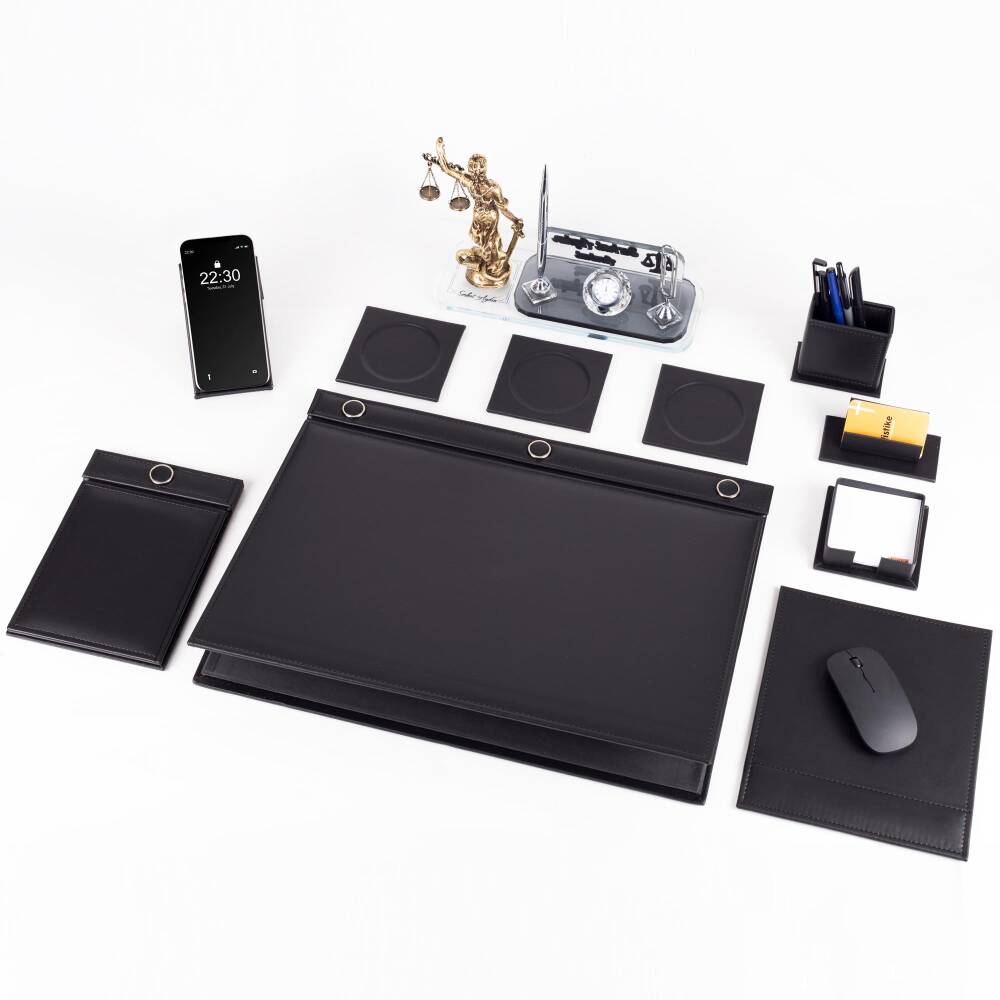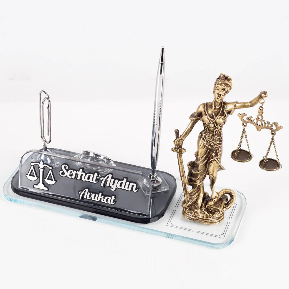 Avukata Themis Heykelli Düğmeli Siyah Sümen Takımı İmza Tasarımlı Masa İsimliği Hediye