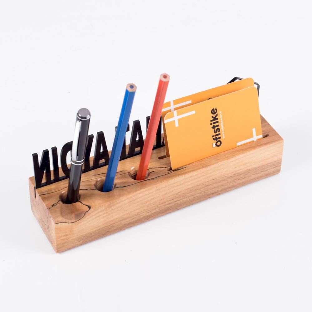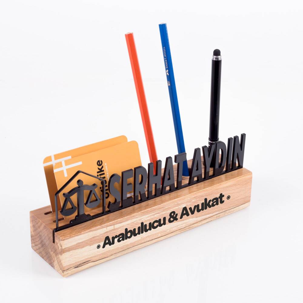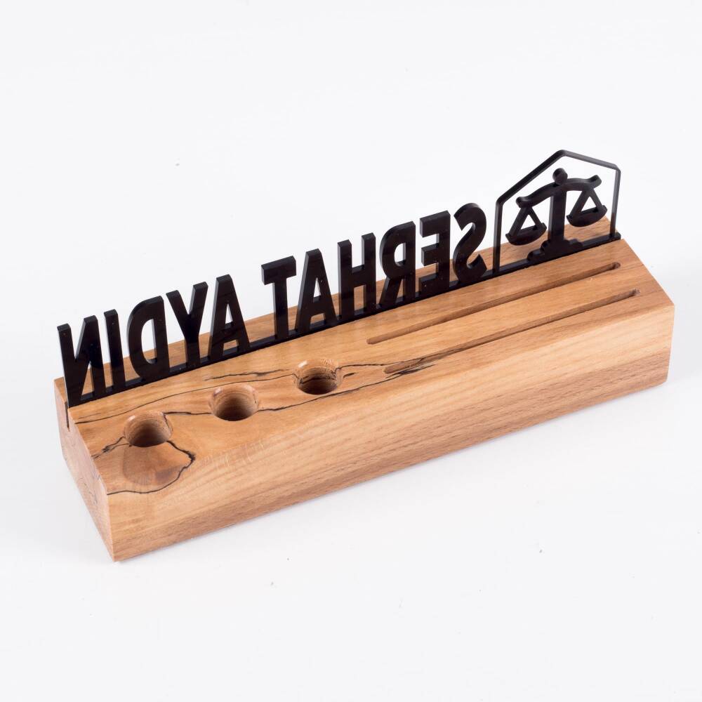 Avukatlara Özel Masif Kayın Ahşap Masa İsimliği Kartvizitlik ve Kalemlikli Masaüstü İsimlik Standı