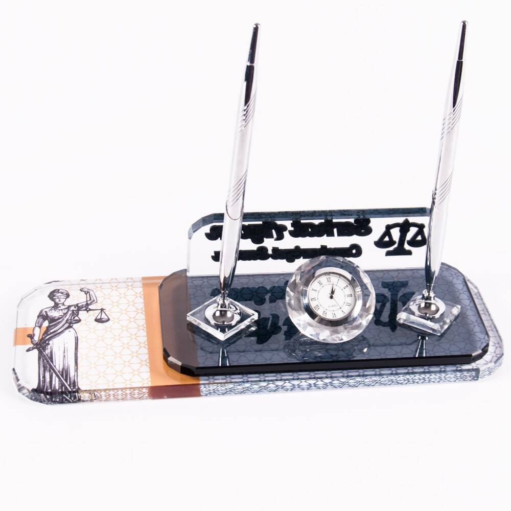 Zeminde bulunan Adalet (Themis) motifi renkli UV baskıdır.