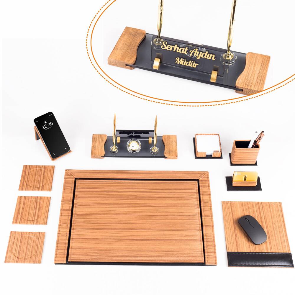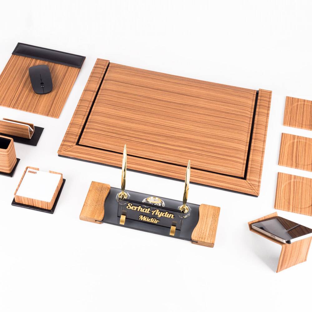 Fantom Ahşap Desenli Ofis Deri Sümen Takımı ve Kristal Masa İsimliği, ofis masanıza şıklık, düzen ve profesyonellik katmak için tasarlanmış özel bir ofis setidir. Toplam 10 parçadan oluşan bu özel set; premium deri malzeme, modern ahşap desen ve yüksek dayanıklı işçilik ile üretilmiştir. Özellikle yöneticiler, müdürler, avukatlar, hakimler, savcılar ve ofis ortamında çalışan herkes için ideal bir hediye seçeneğidir.