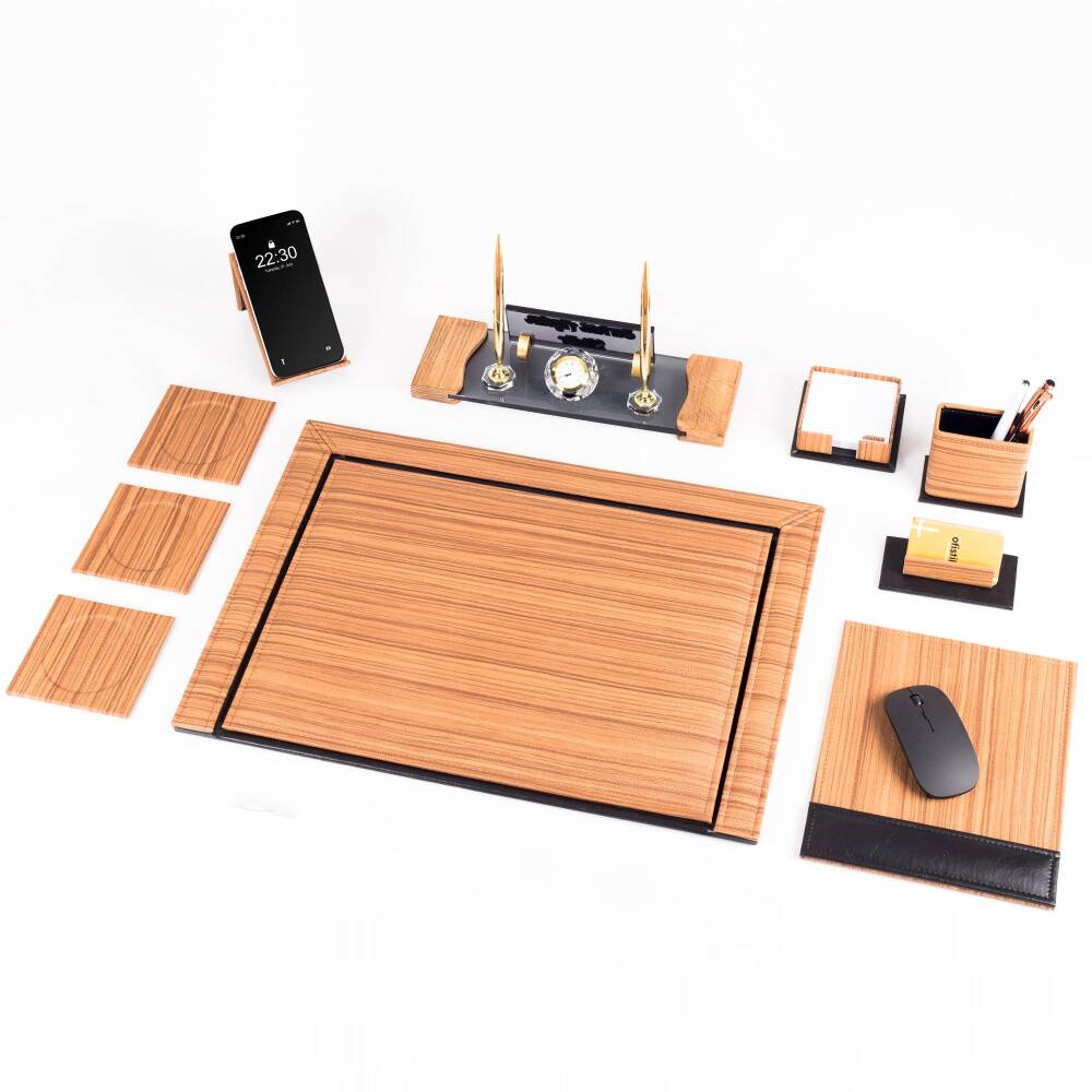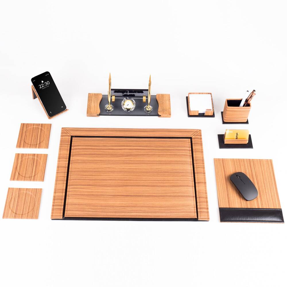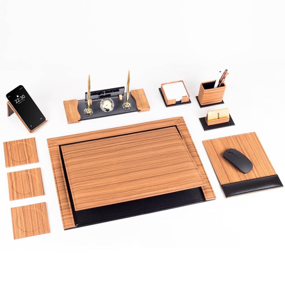 Sümen takımı 50x35 cm ölçüsünde geniş bir yüzeye sahiptir ve ahşap desenli kaplaması sayesinde masanızda modern bir görünüm oluşturur. Aynı zamanda mousepad, notluk, kartvizitlik, telefon standı ve bardak altlıkları gibi yardımcı parçalar, ofiste en çok kullanılan tüm aksesuarları düzenli şekilde bir araya getirir.