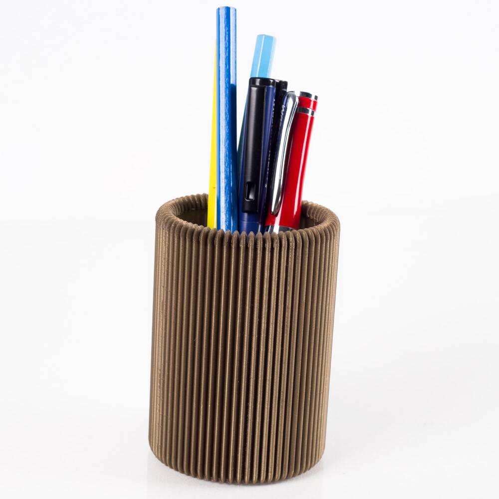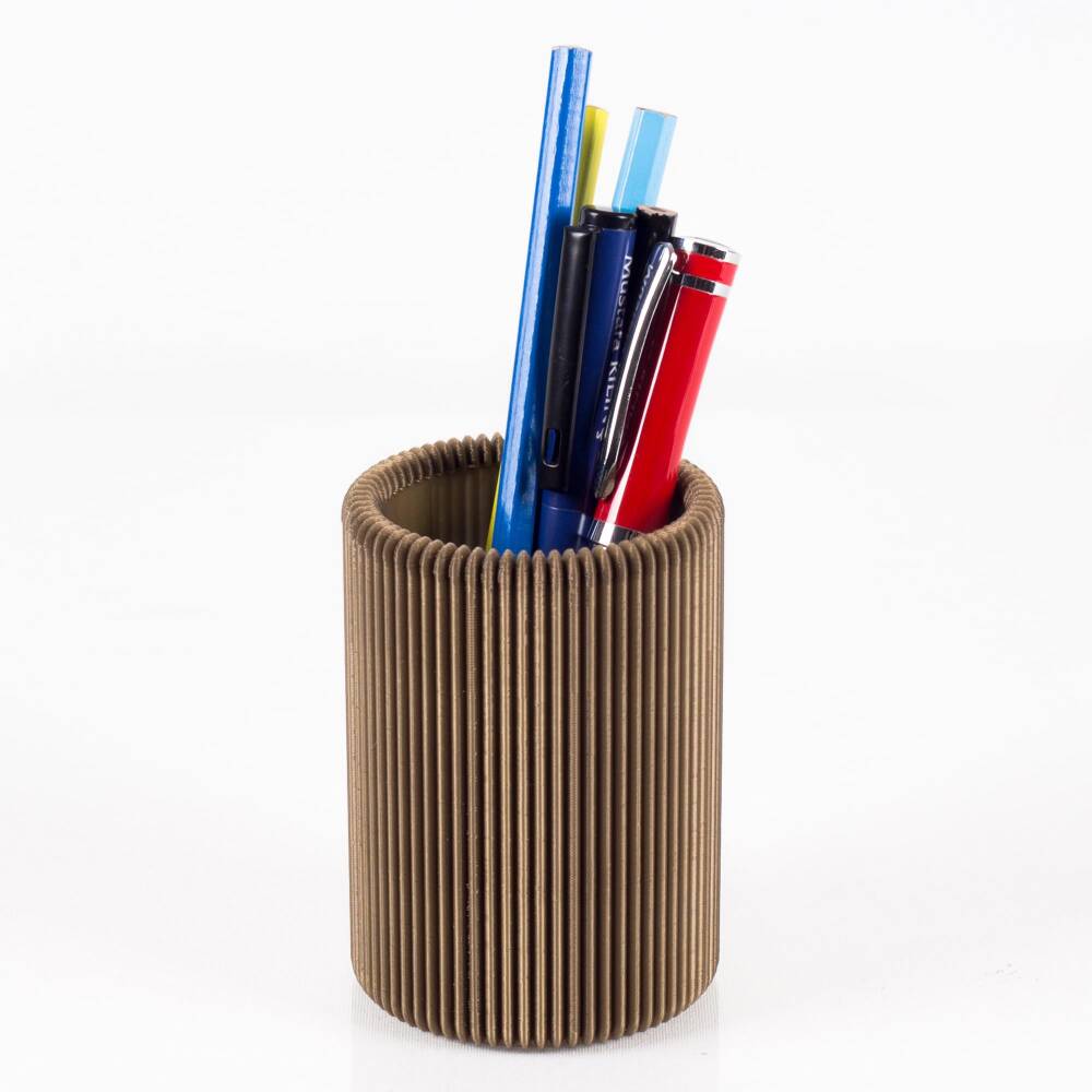 Altın renk PLA malzemeden 3D baskı yöntemi ile çizgi desenli üretilmektedir.