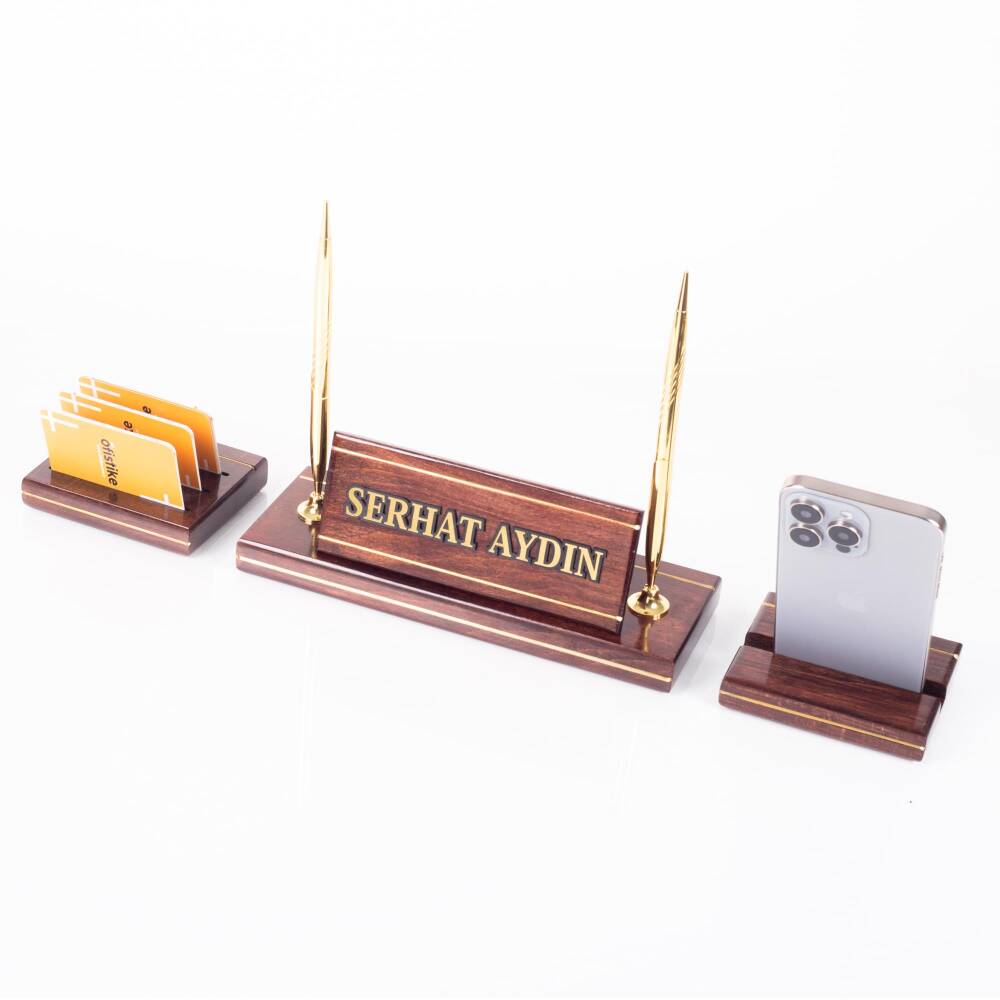 - Masa İsimliği üzerinde 2 adet kalem ve saat yer almaktadır. İsimliğin sağında telefon tutacağı alanı ve sol kısmında kartvizitlik alanı bulunmaktadır.