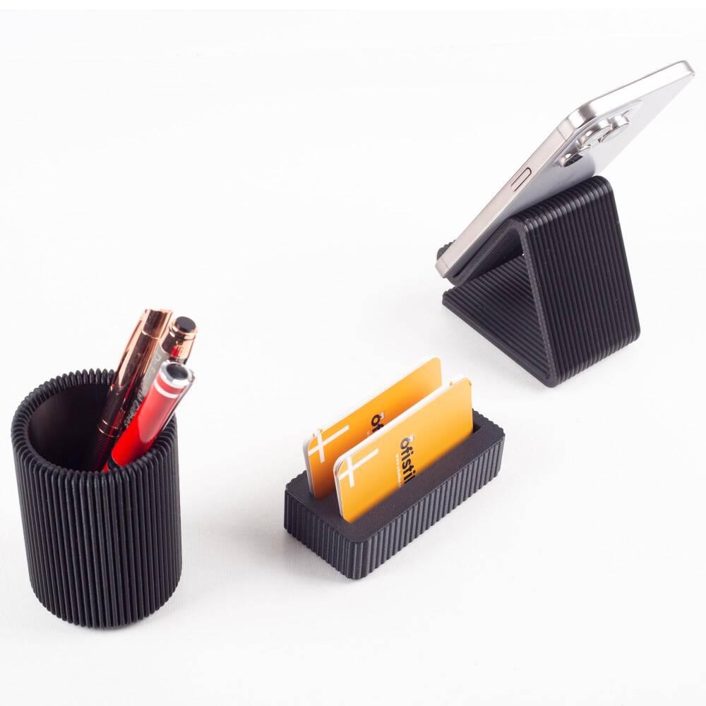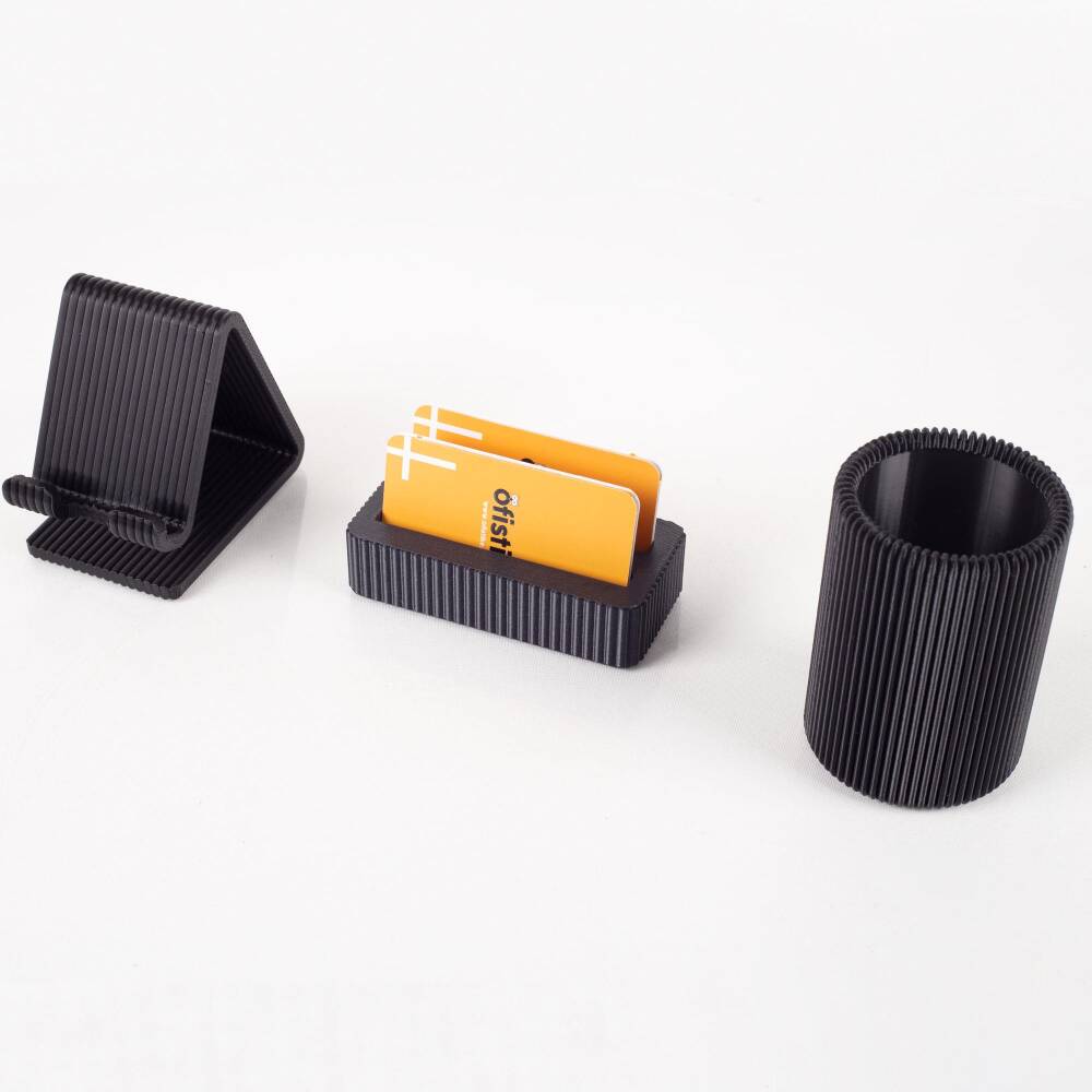 Kalemlik telefonluk ve kartivizitlik PLA malzemeden, çizgi desenli olarak üretilmektedir.