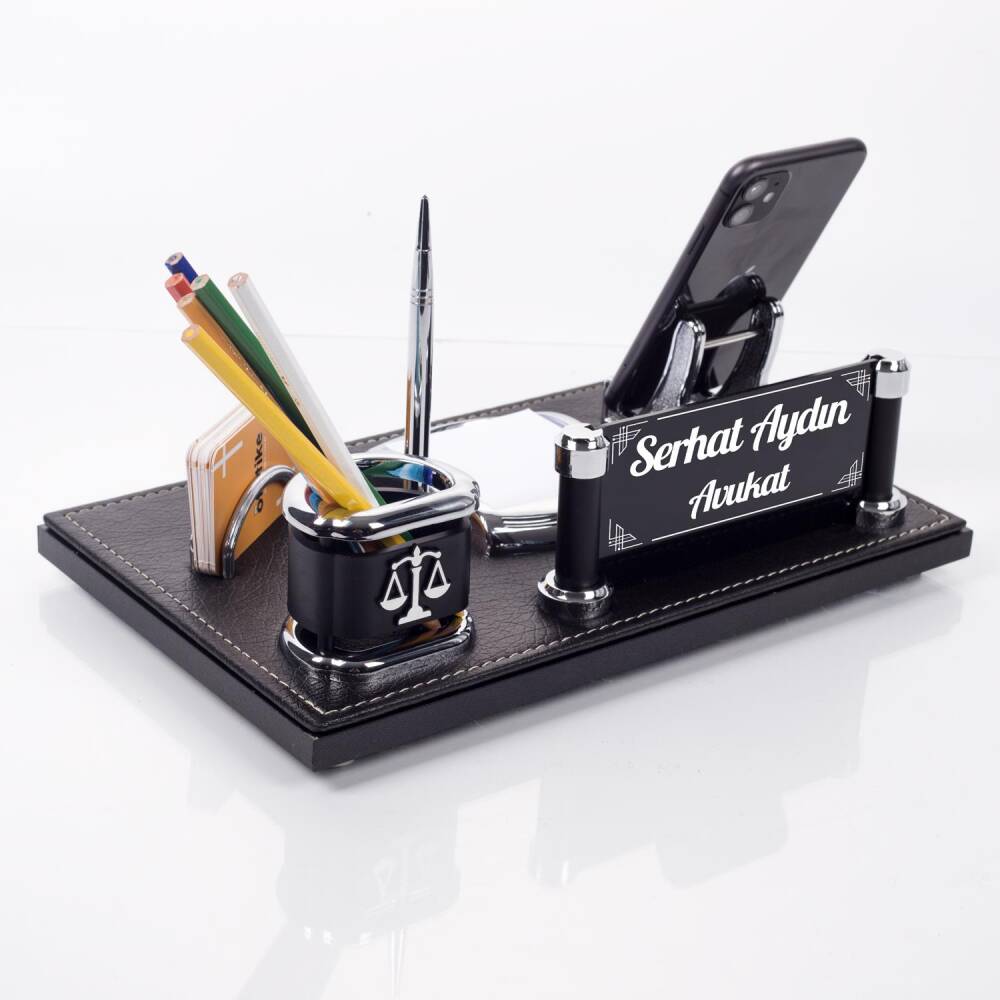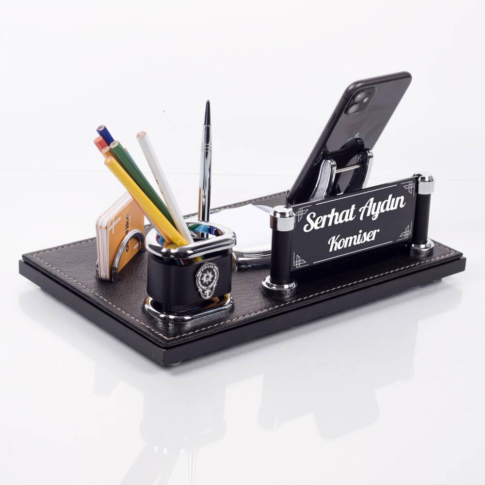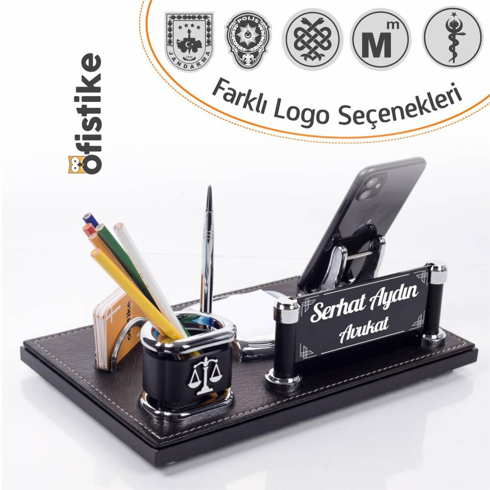Masa organizeri üzerinde yer alan kalemlik üzerine logo işlemesi yapılmaktadır. Ürün görsellerinde bulunan (Polis, Avukat, Doktor, Jandarma, Muhasebeci, Veteriner Hekim,Eczacı vb.) logo çeşitleri arasından dilediğinizi seçerek sipariş oluşturabilirsiniz.