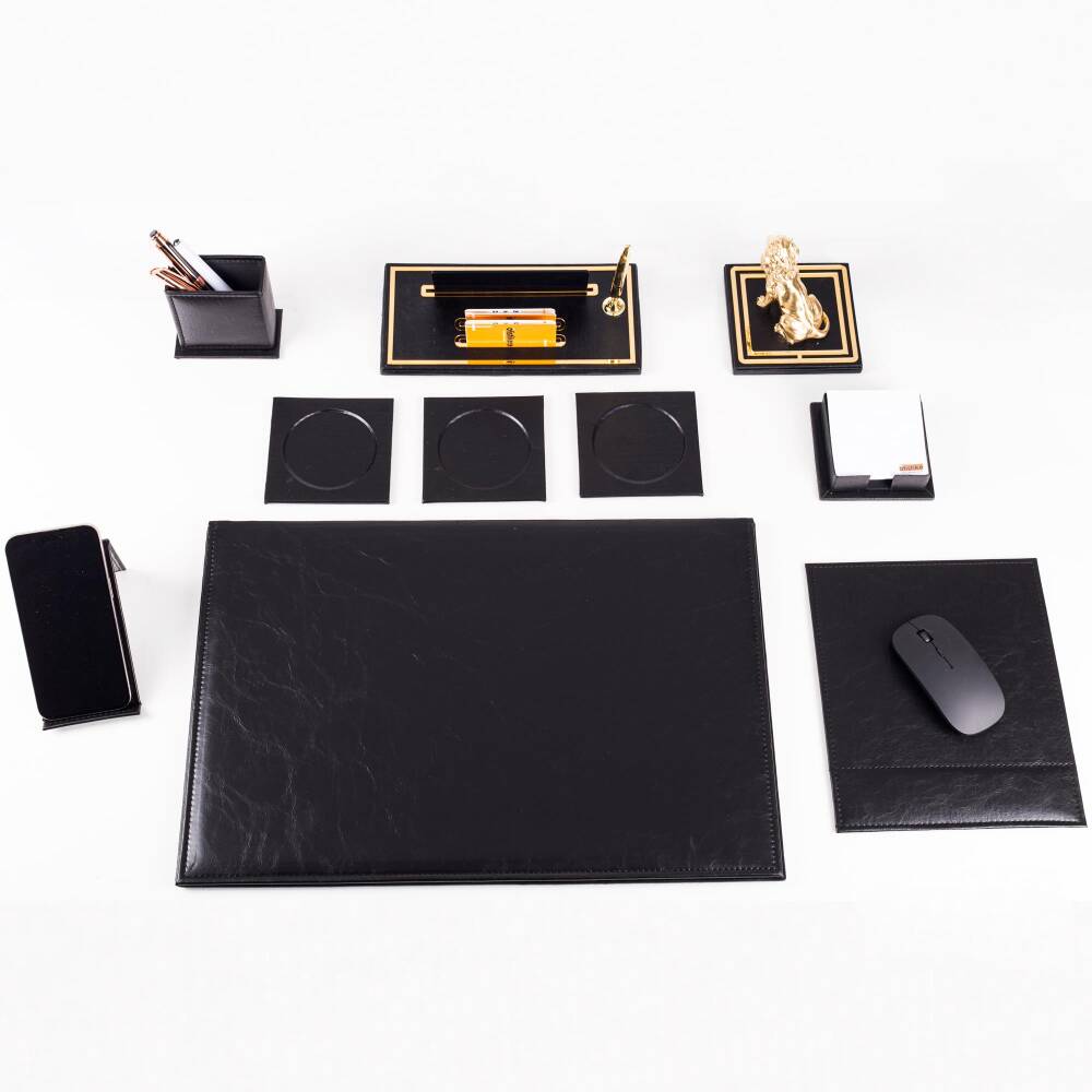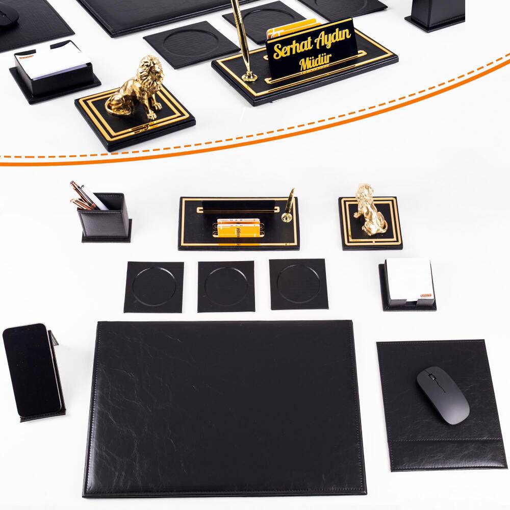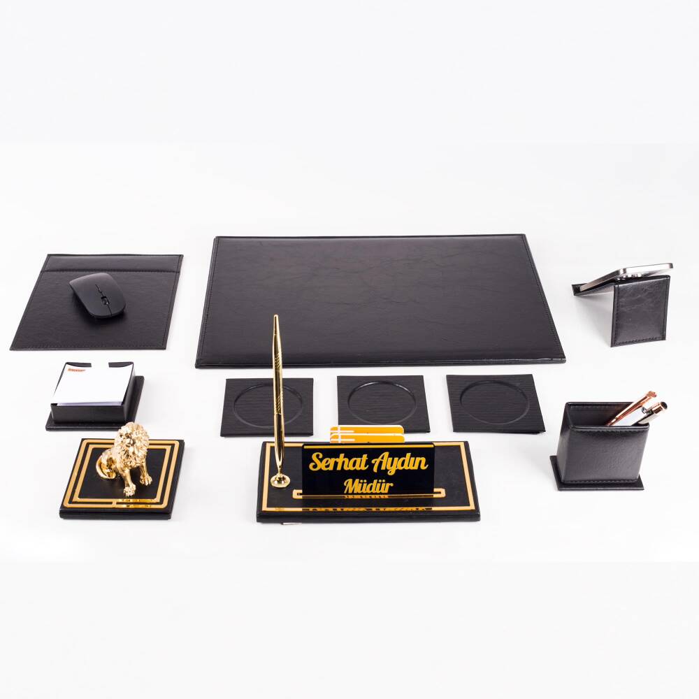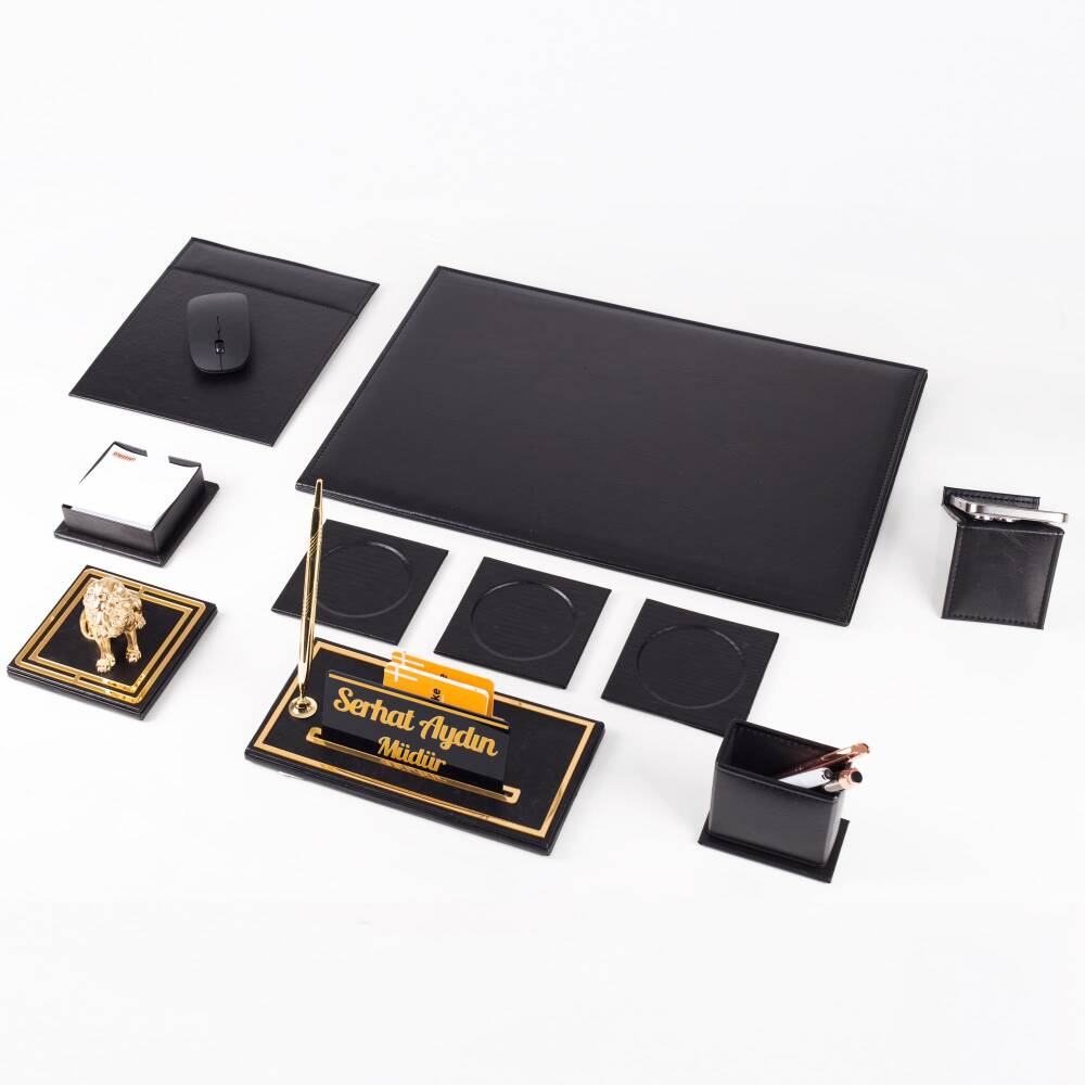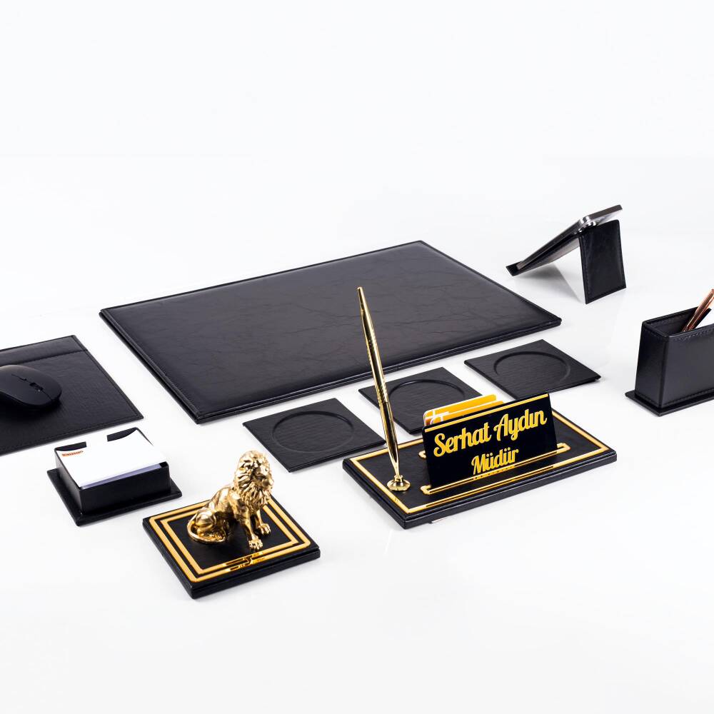 Masa isimliği üzerinde gold renk tükenmez kalem, kartvizitlik gözleri ve isimlik plakası yuvası bulunmaktadır.