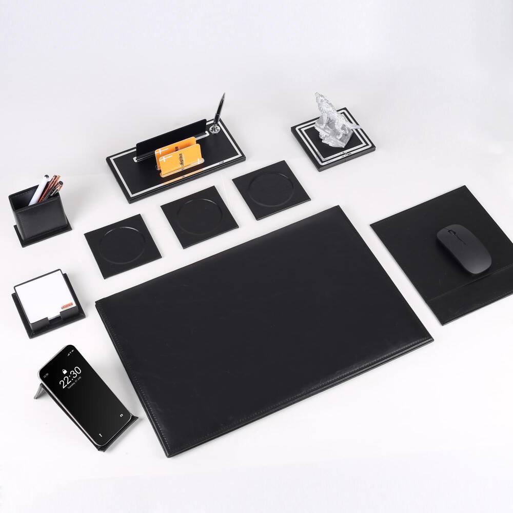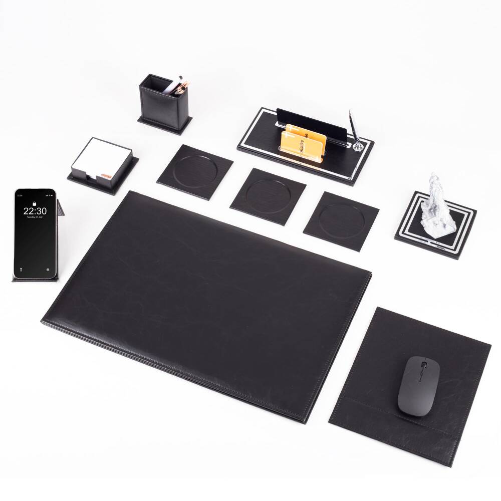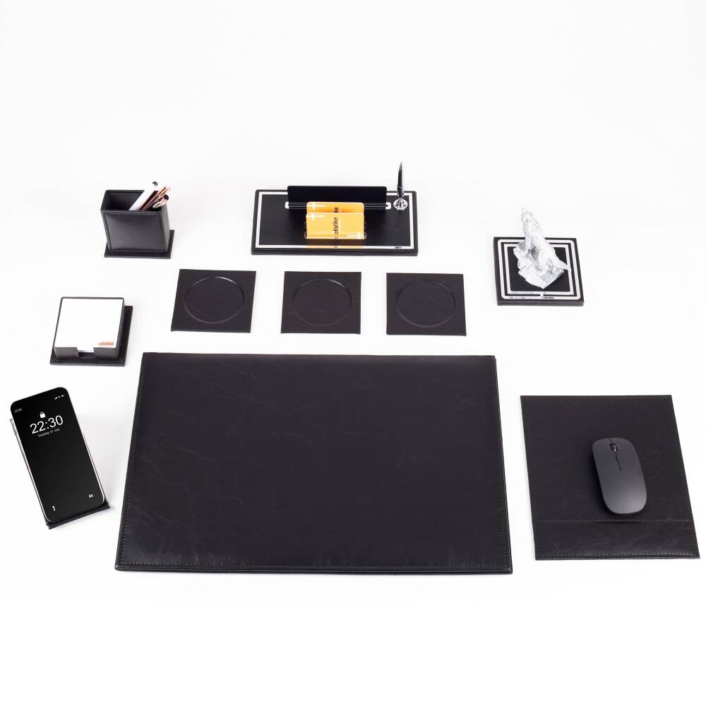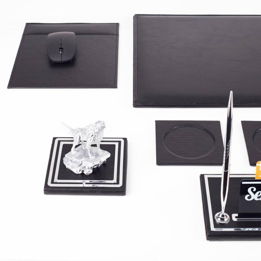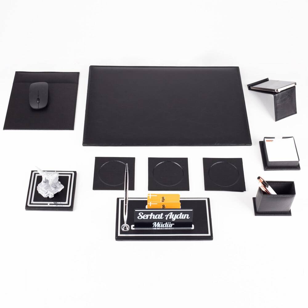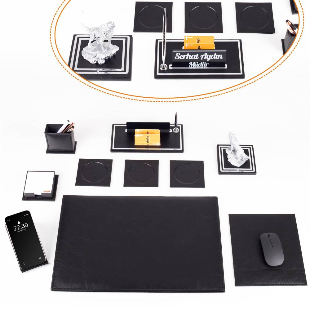 Masa isimliği üzerinde gümüş renk tükenmez kalem, kartvizitlik gözleri ve isimlik plakası yuvası bulunmaktadır.