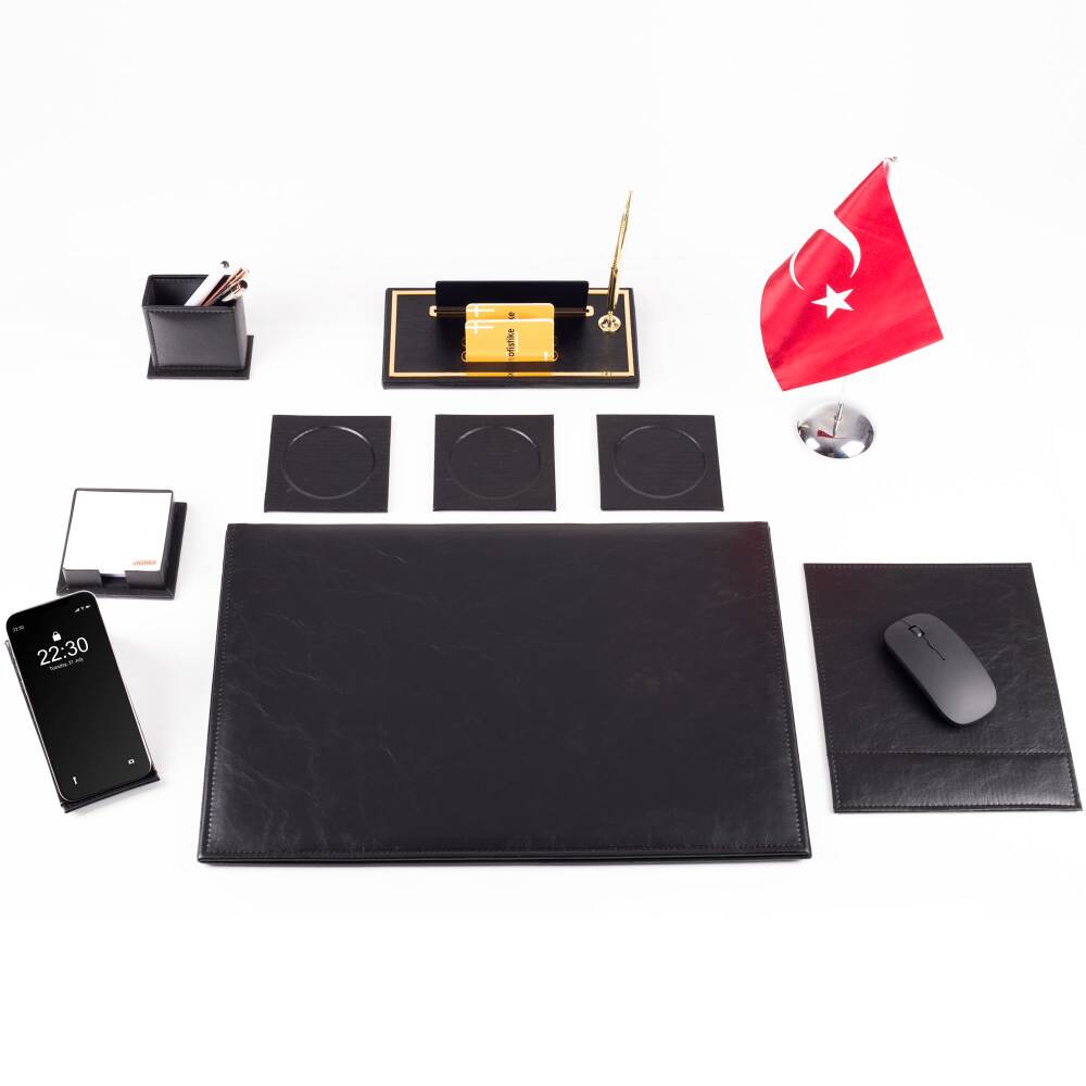 Masa isimliği üzerinde gold renk tükenmez kalem, kartvizitlik gözleri ve isimlik plakası yuvası bulunmaktadır.