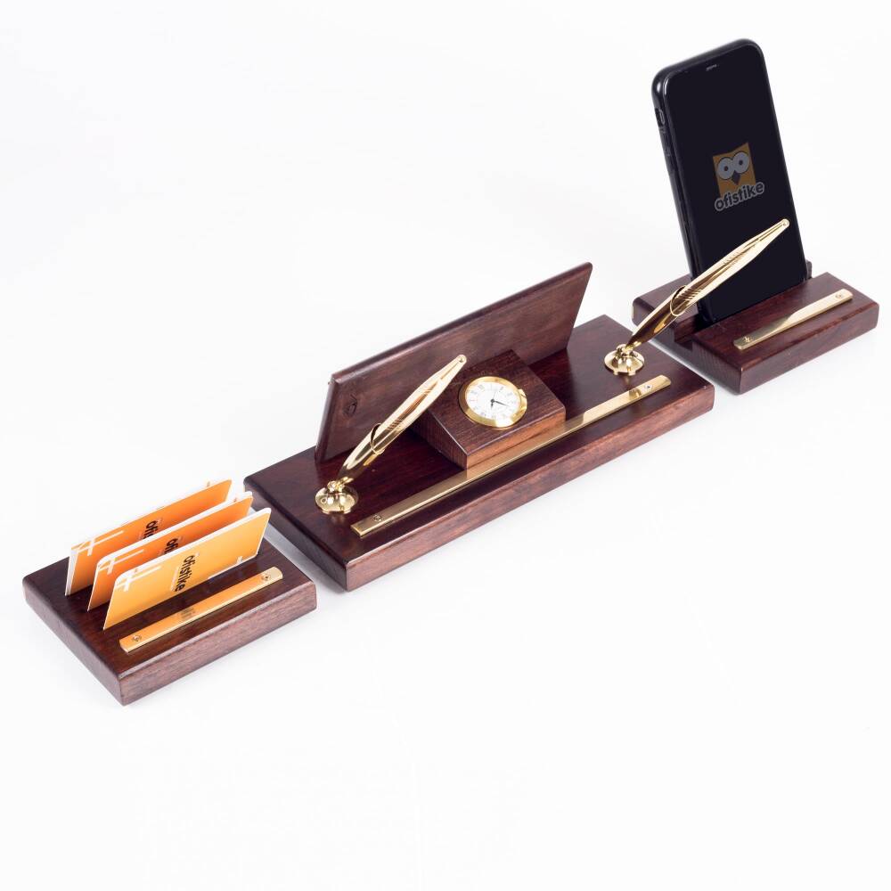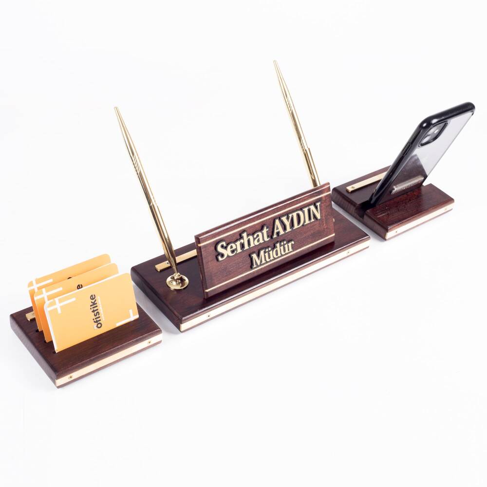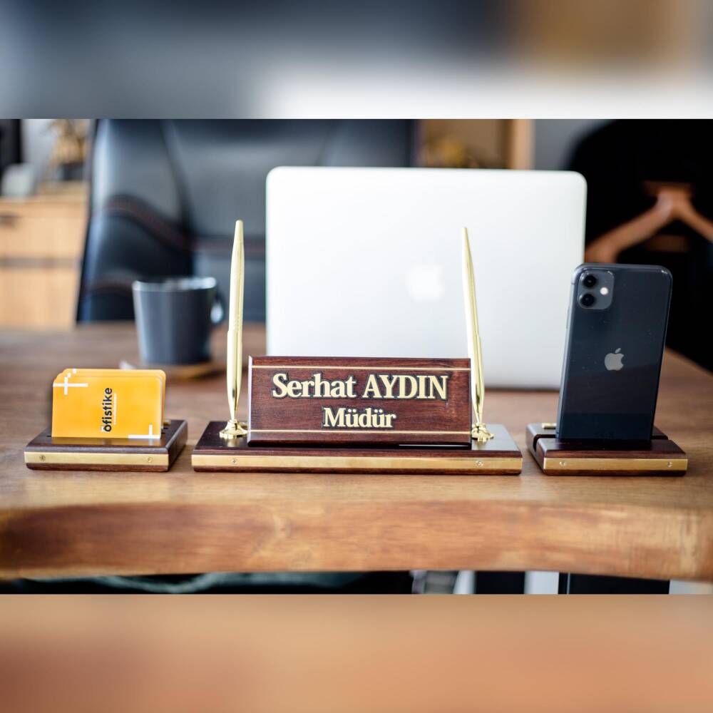 - Masa İsimliği üzerinde 2 adet kalem ve saat yer almaktadır. İsimliğin sağında telefon tutacağı alanı ve sol kısmında kartvizitlik alanı bulunmaktadır.