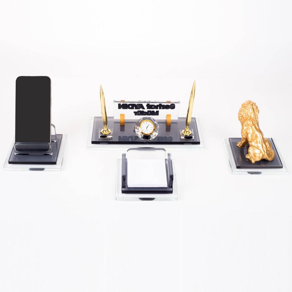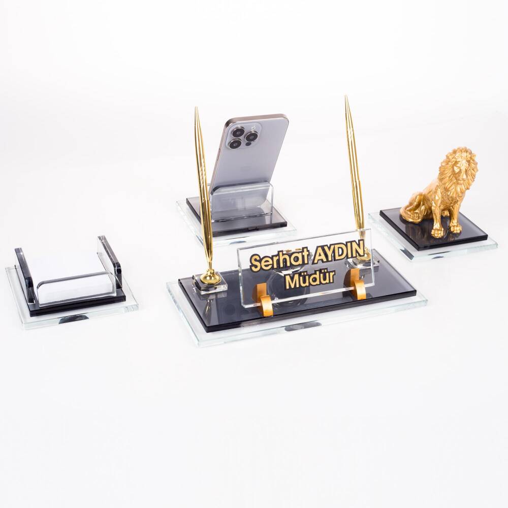 Ürün, masa isimliği, telefon tutucu ve notluk olarak 4 parçadan oluşmaktadır. Ürün iki katlı 8mm kalınlığında kristal camdan üretilmektedir.