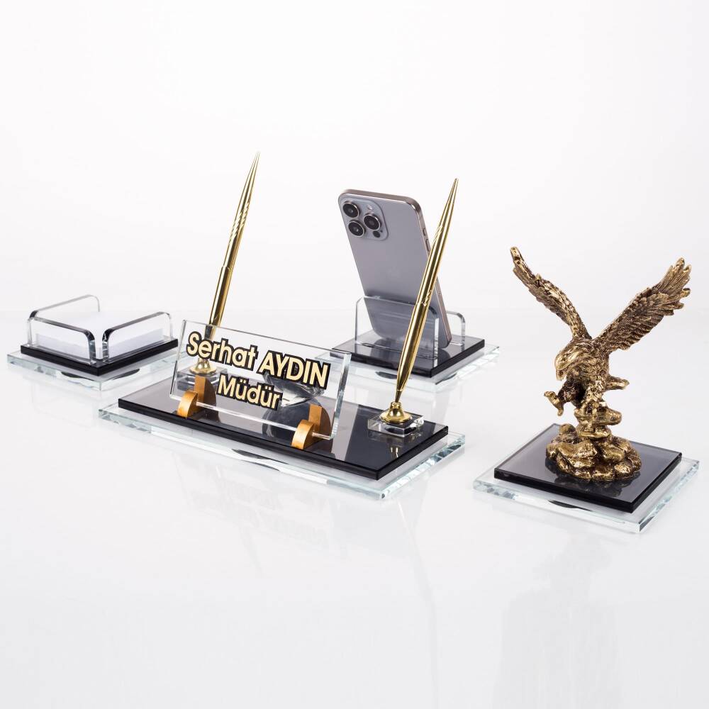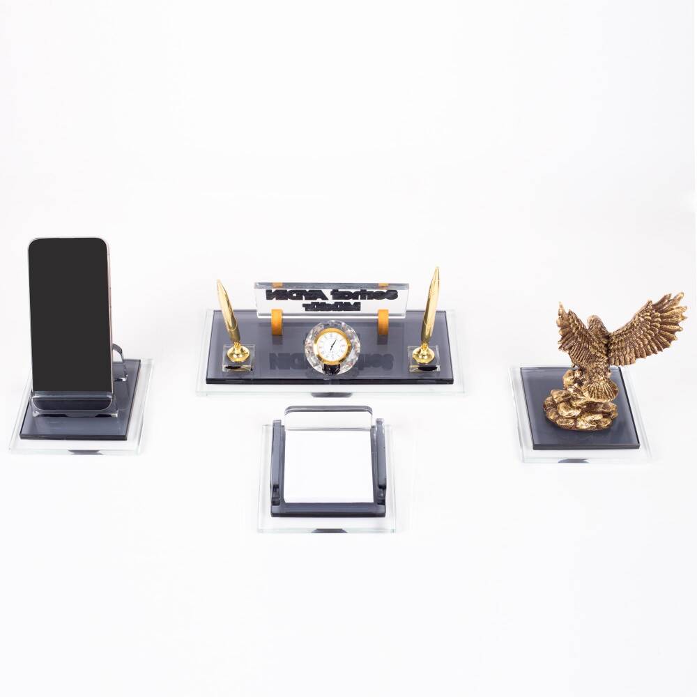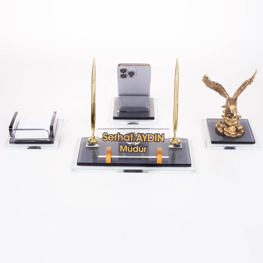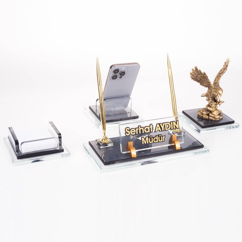 Ürün, masa isimliği, telefon tutucu ve notluk olarak 4 parçadan oluşmaktadır. Ürün iki katlı 8mm kalınlığında kristal camdan üretilmektedir.