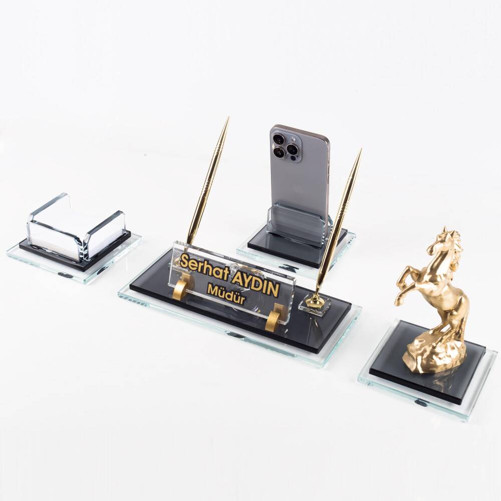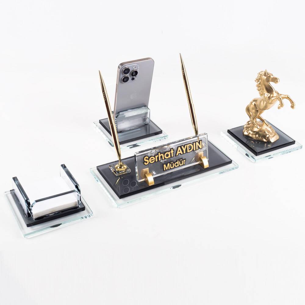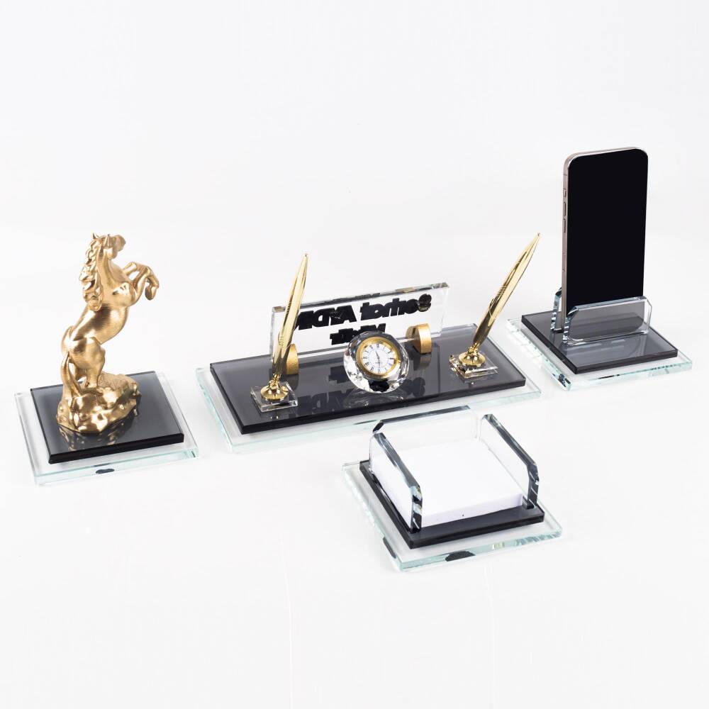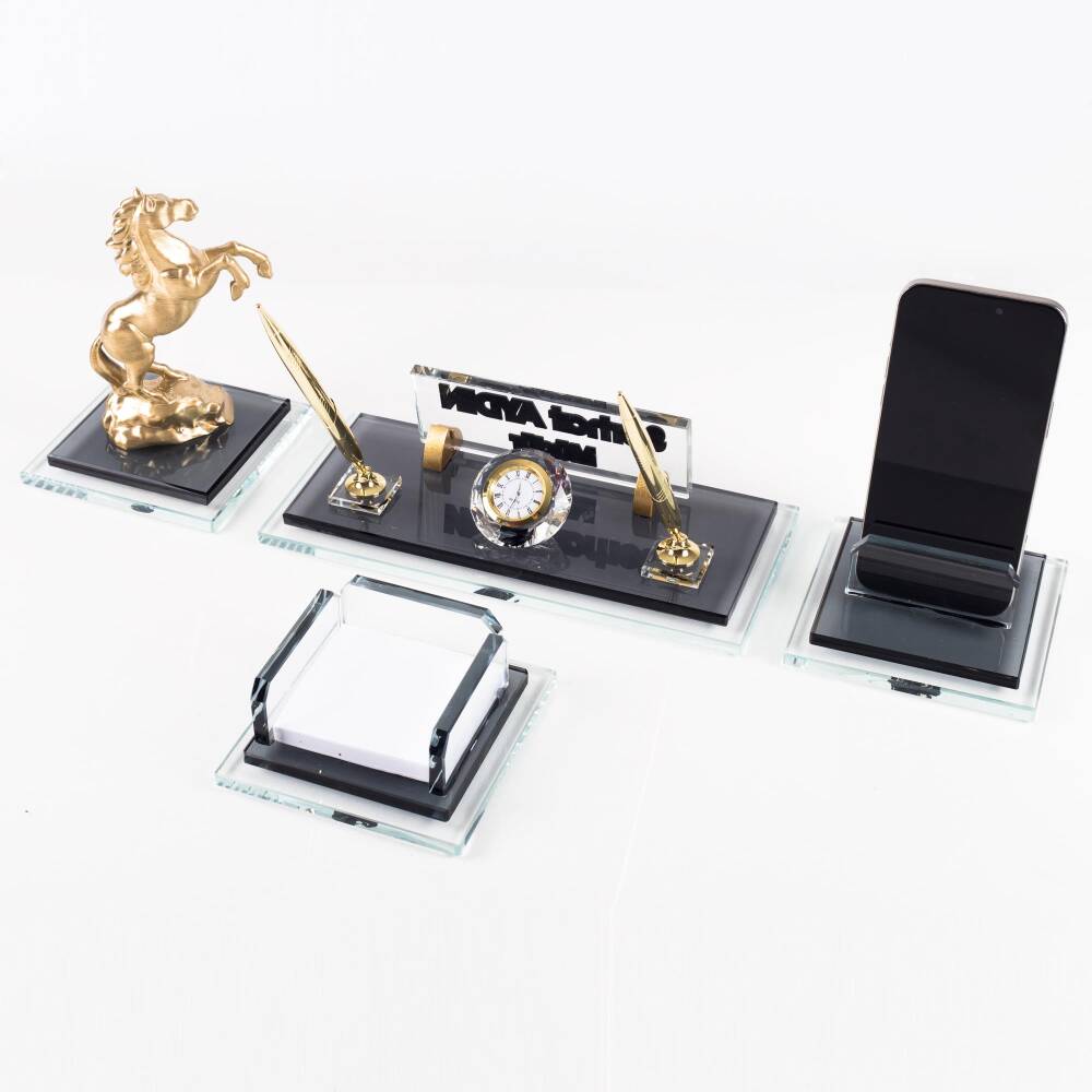 Ürün, masa isimliği, telefon tutucu ve notluk olarak 4 parçadan oluşmaktadır. Ürün iki katlı 8mm kalınlığında kristal camdan üretilmektedir.
