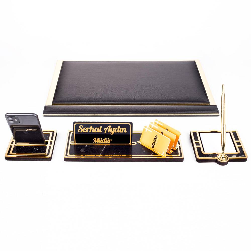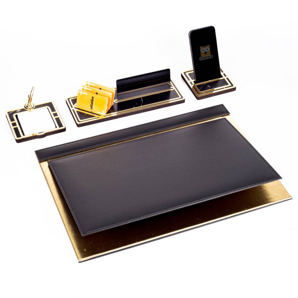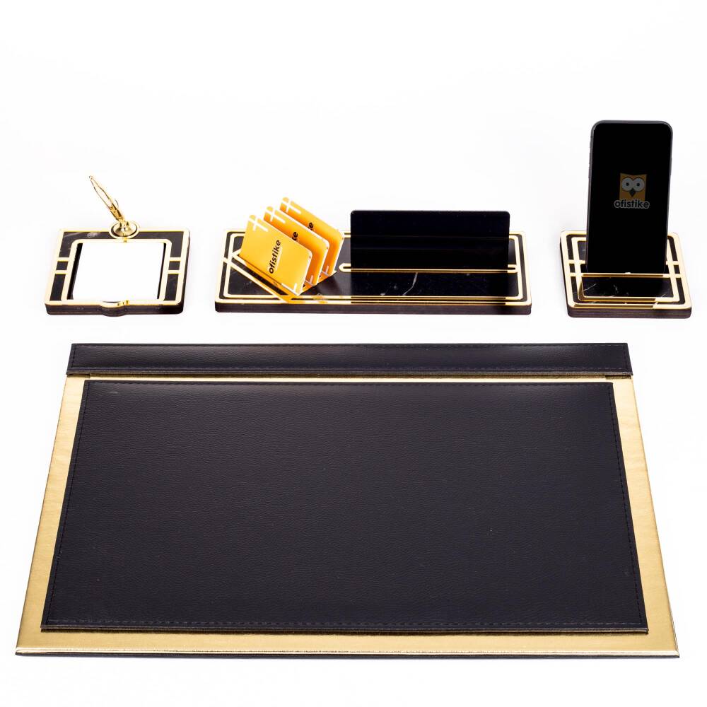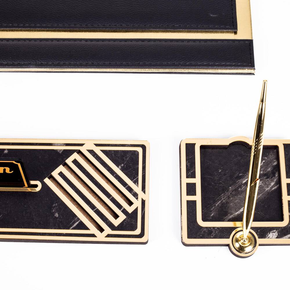 Ürün içeriğinde, 28x12cm ebatında 12mm kalınlığında, kartvizitlikli ahşap isimlik seti, 11x11cm ebatında gold kalemli not kağıtlığı ve telefon tutucu mevcuttur.