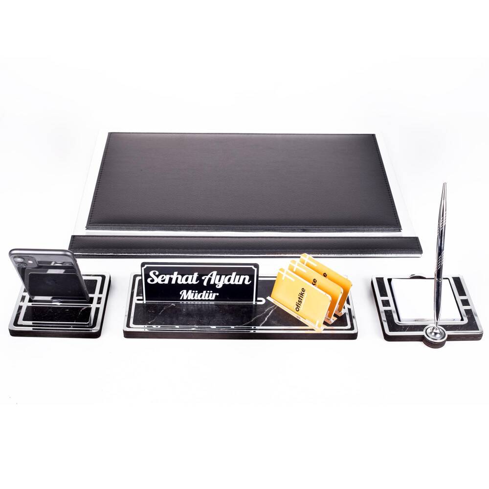 Ürün içeriğinde, 28x12cm ebatında 12mm kalınlığında, kartvizitlikli ahşap isimlik seti, 11x11cm ebatında gümüş kalemli not kağıtlığı ve telefon tutucu mevcuttur.