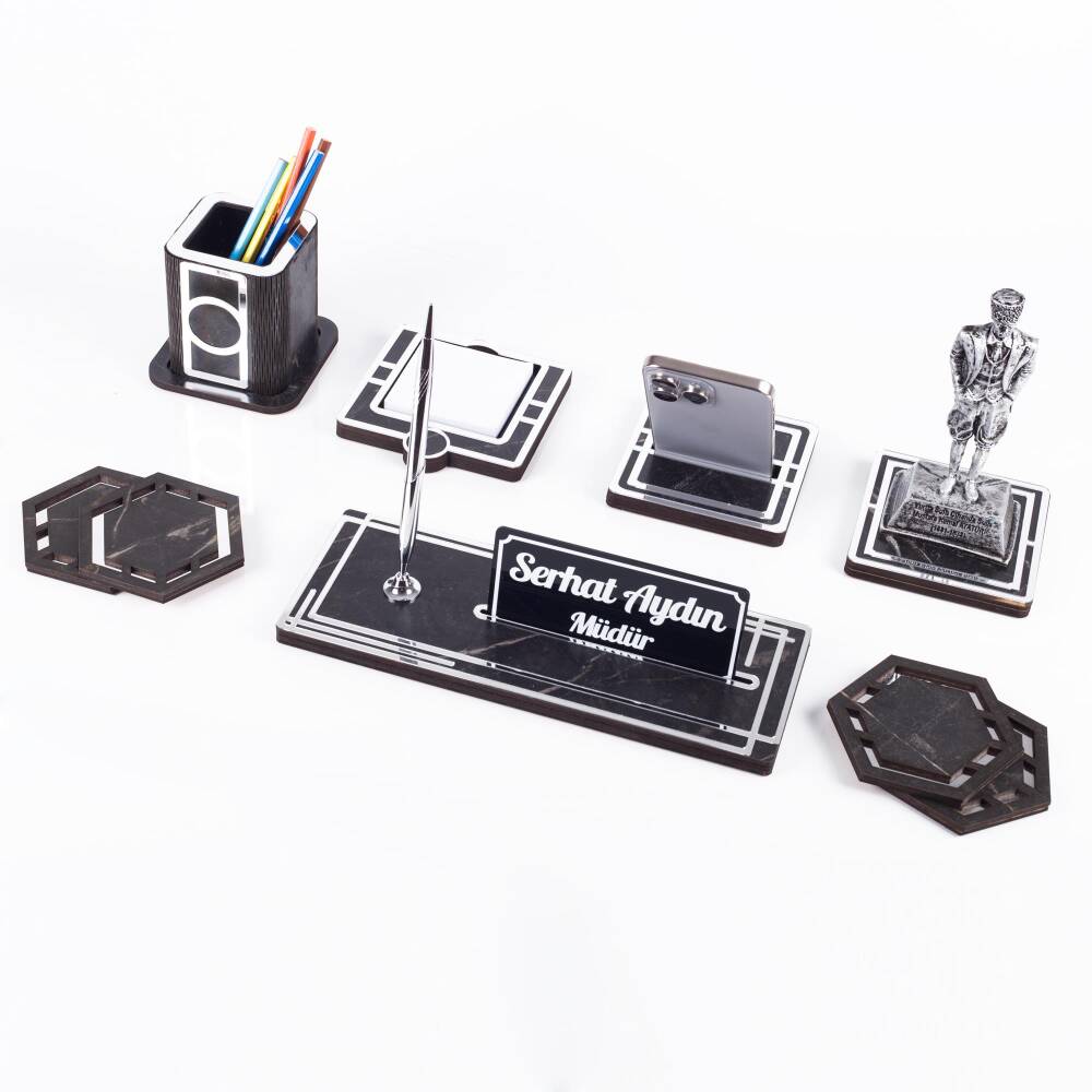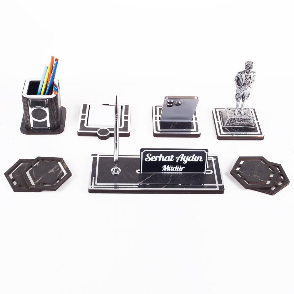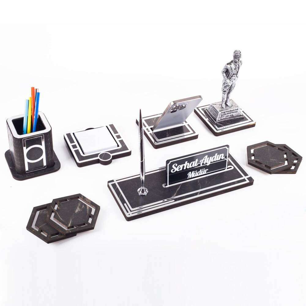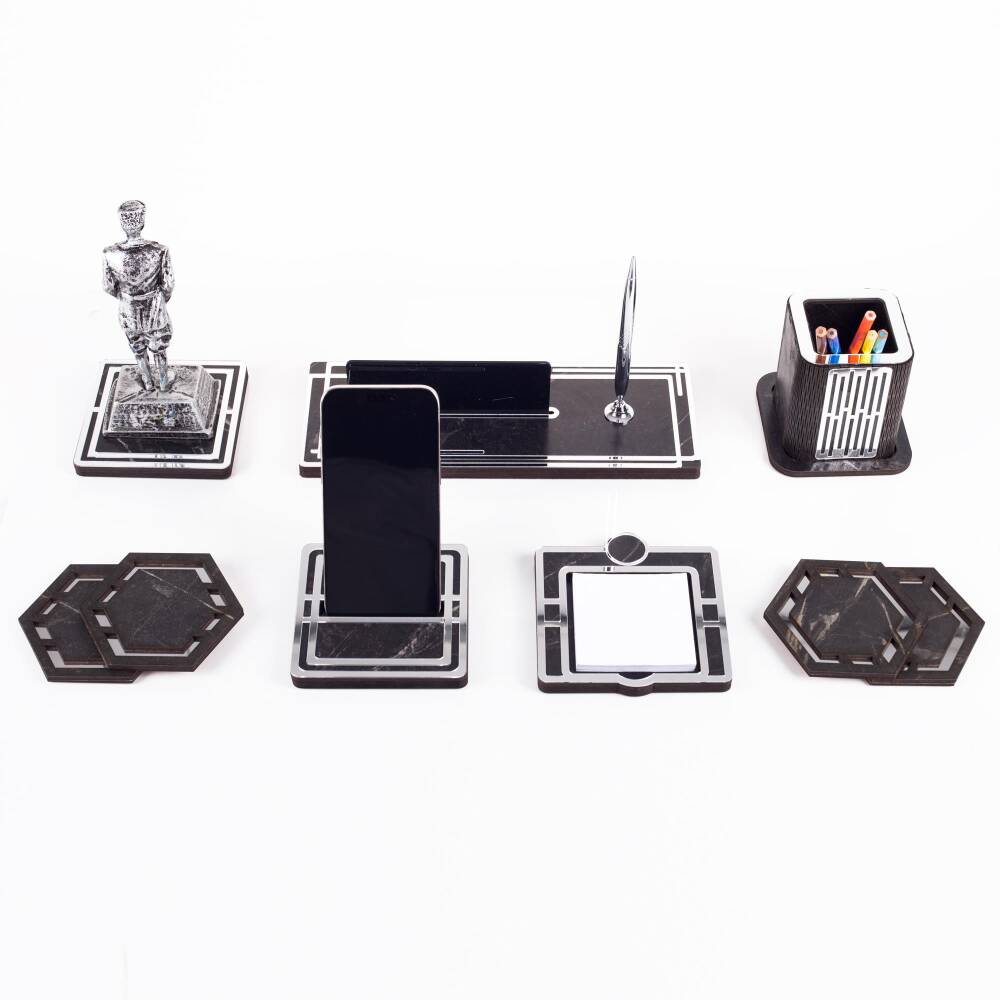Set içeriğinde 12x12cm ebatında telefonluk, 12x12cm ebatında notluk, 4 adet bardak altlığı ve 10cm yüksekliğinde kalemlik bulunmaktadır.