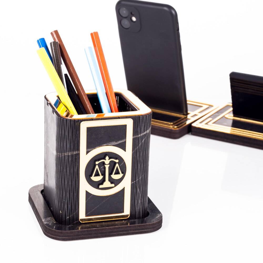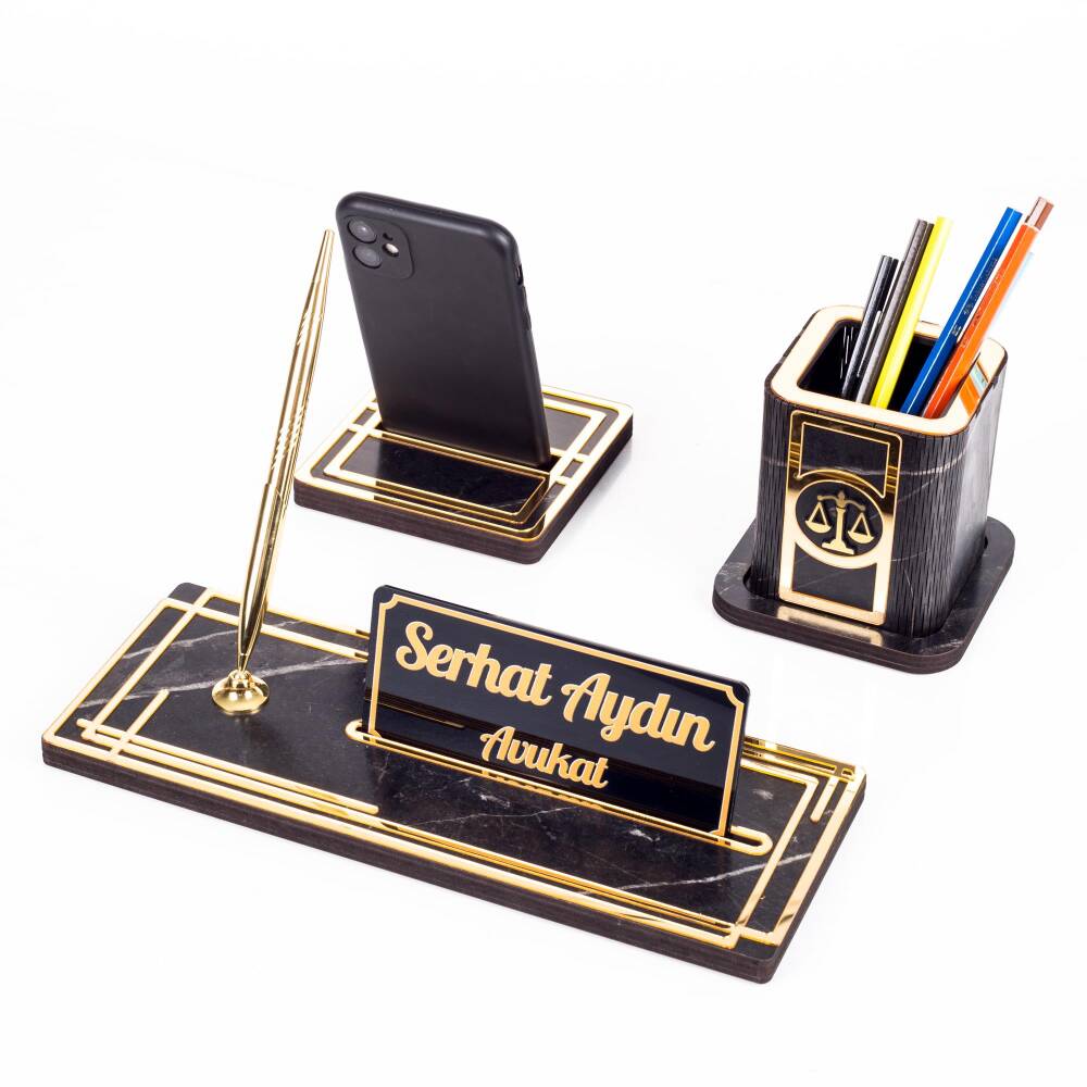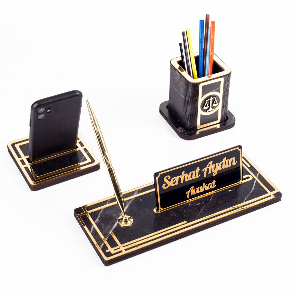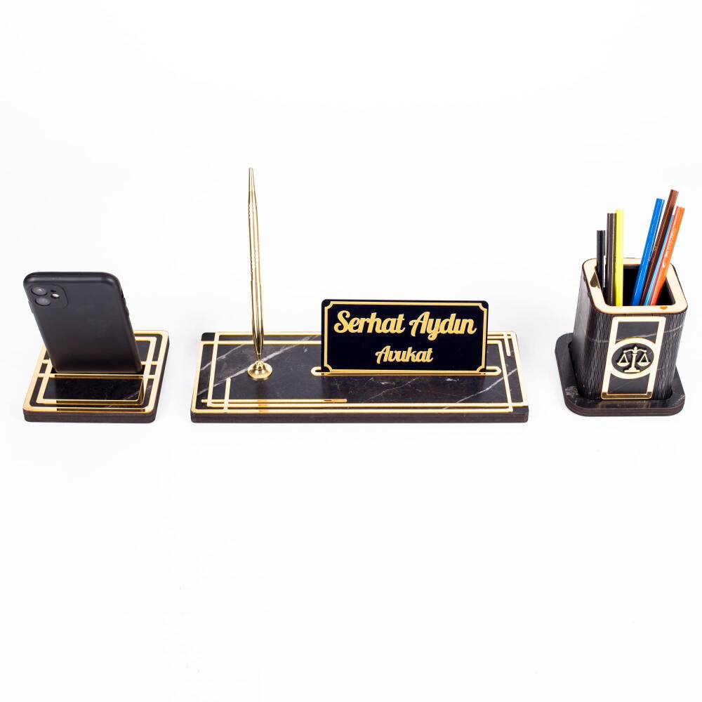 Space Avukatlara Özel Kalemlikli Ahşap Masa İsimliği Seti Mermer Desenli Hediye Ofis Masa İsimlik