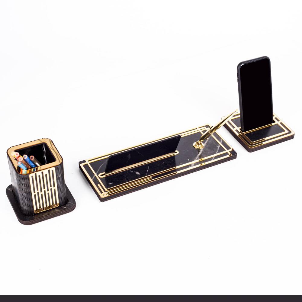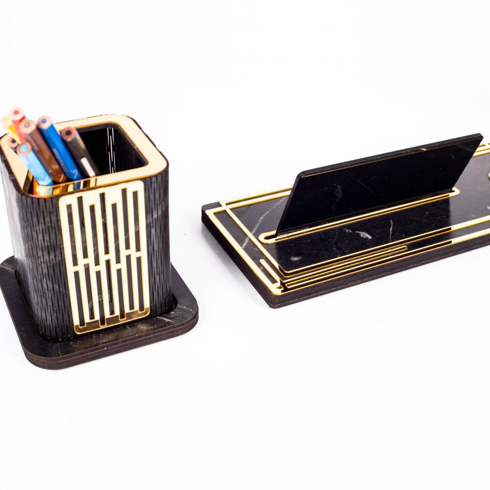 Set içeriğinde 12x12cm ebatında telefonluk ve 10cm yüksekliğinde kalemlik bulunmaktadır.