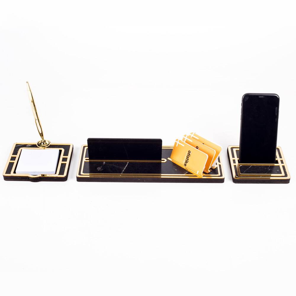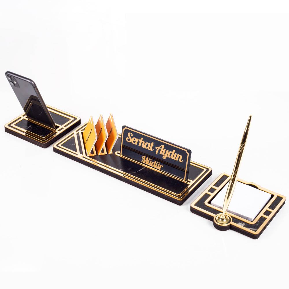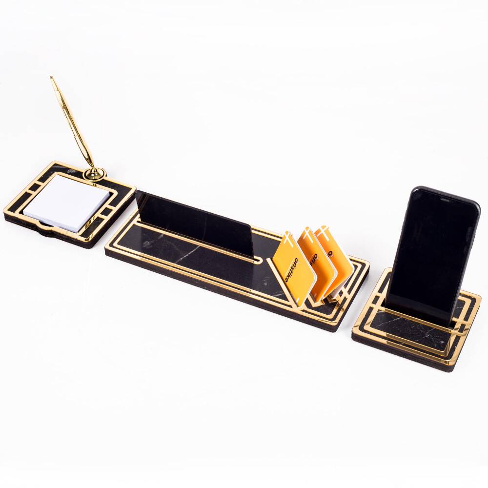 Set içerisinde 1 adet 12x12cm telefon standı, 12x12 cm boyunda gold kalemli notluk yer almaktadır.