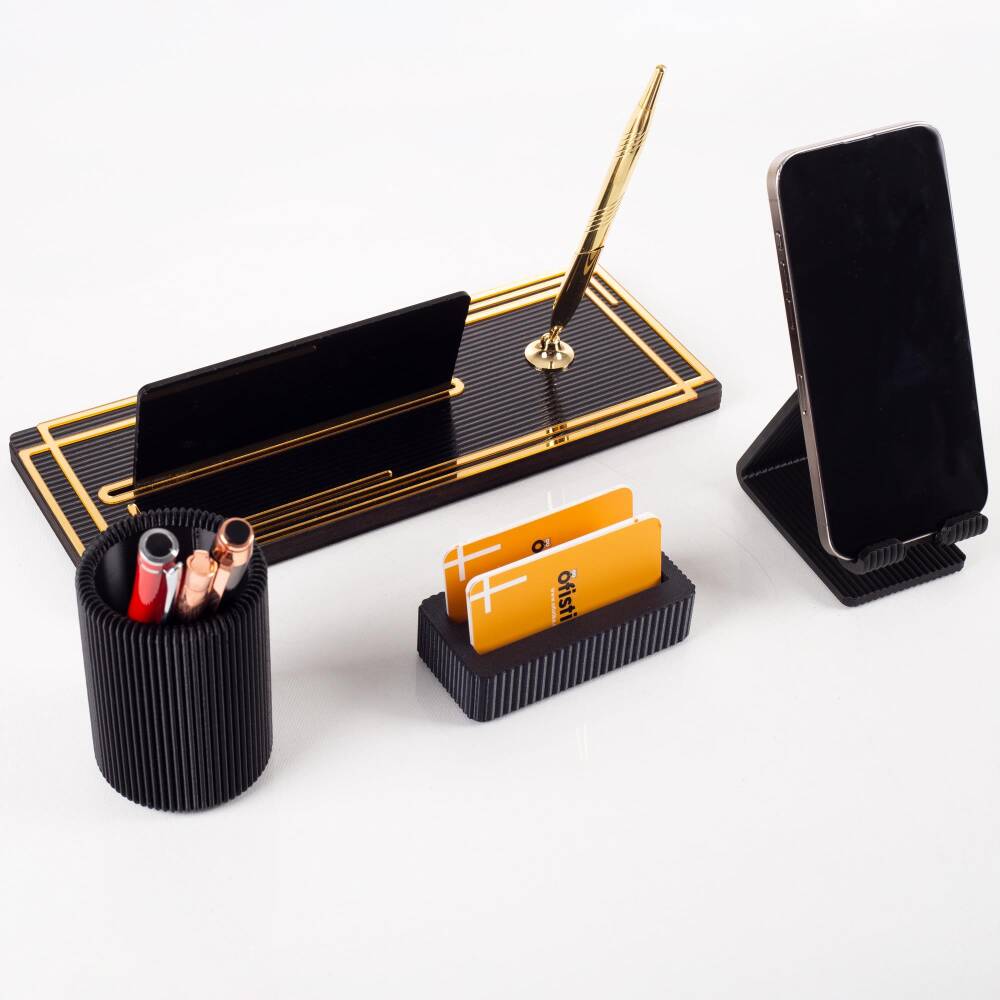 Set içeriğinde telefonluk, ve 10cm yüksekliğinde kalemlik ve kartvizitlik bulunmaktadır.