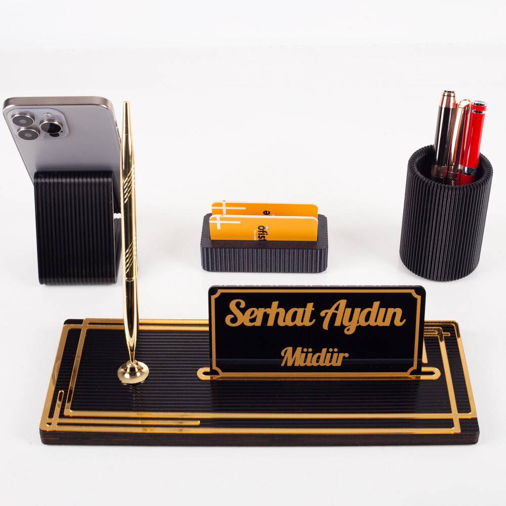 İsimlik üzerindeki detaylar çizgi desenlidir. UV Baskı tekniği ile hazırlanmaktadır. Kalemlik ve telefonluk PLA malzemeden, çizgi desenli olarak üretilmektedir.